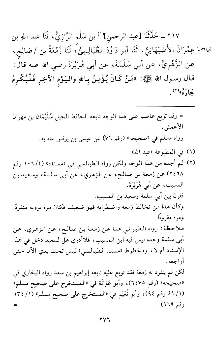 217 - حَدَّثَنَا عبد الرحمن (1) بْنُ سَلْمٍ الرَّازِيُّ، حَدَّثَنَا عَبْدُ اللَّهِ بْنُ عِمْرَانَ الْأَصْبَهَانِيُّ، حَدَّثَنَا أَبُو دَاوُدَ الطَّيَالِسِيُّ، حَدَّثَنَا زَمْعَةُ بْنُ صَالِحٍ، عَنِ الزُّهْرِيِّ، عَنْ أَبِي سَلَمَةَ، عَنْ أَبِي هُرَيْرَةَ رَضِيَ اللَّهُ عَنْهُ قَالَ: قَالَ رَسُولُ اللَّهِ صَلَّى اللَّهُ عَلَيْهِ وَسَلَّمَ: "مَنْ كَانَ يُؤْمِنُ بِاللَّهِ وَالْيَوْمِ الْآخِرِ فَلْيُكْرِمْ جَارَهُ".