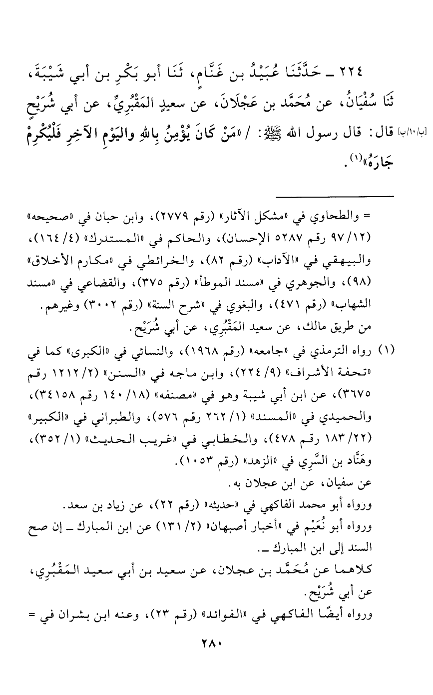224 - حَدَّثَنَا عُبَيْدُ بْنُ غَنَّامٍ، حَدَّثَنَا أَبُو بَكْرِ بْنُ أَبِي شَيْبَةَ، حَدَّثَنَا سُفْيَانُ، عَنْ مُحَمَّدِ بْنِ عَجْلَانَ، عَنْ سَعِيدٍ الْمَقْبُرِيِّ، عَنْ أَبِي شُرَيْحٍ قَالَ: قَالَ رَسُولُ اللَّهِ صَلَّى اللَّهُ عَلَيْهِ وَسَلَّمَ: "مَنْ كَانَ يُؤْمِنُ بِاللَّهِ وَالْيَوْمِ الْآخِرِ فَلْيُكْرِمْ جَارَهُ".