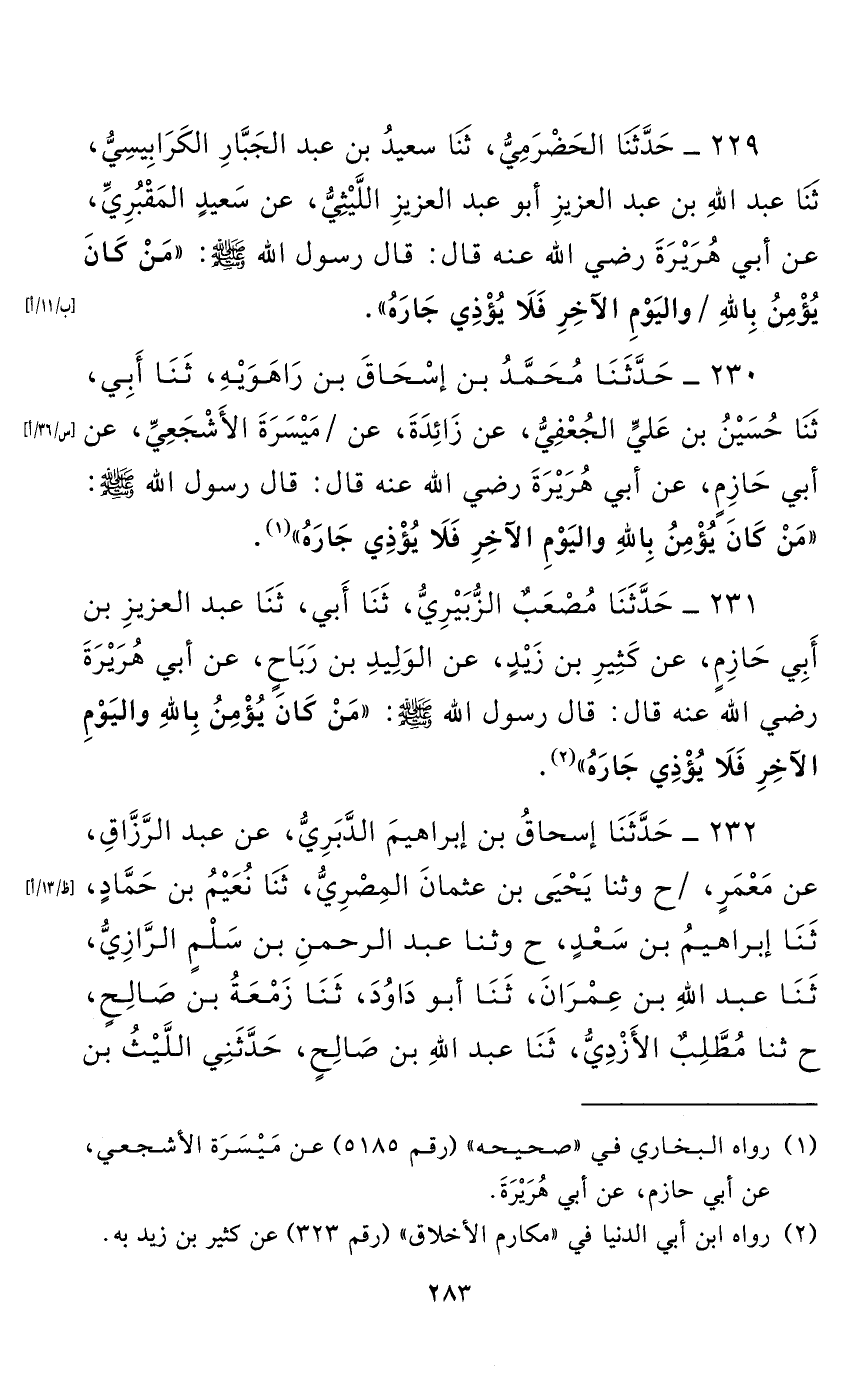 232 - حَدَّثَنَا إِسْحَاقُ بْنُ إِبْرَاهِيمَ الدَّبَرِيُّ، عَنْ عَبْدِ الرَّزَّاقِ، عَنْ مَعْمَرٍ (ح) وَحَدَّثَنَا يَحْيَى بْنُ عُثْمَانَ الْمِصْرِيُّ، حَدَّثَنَا نُعَيْمُ بْنُ حَمَّادٍ، حَدَّثَنَا إِبْرَاهِيمُ بْنُ سَعْدٍ (ح) وَحَدَّثَنَا عَبْدُ الرَّحْمَنِ بْنُ سَلْمٍ الرَّازِيُّ، حَدَّثَنَا عَبْدُ اللَّهِ بْنُ عِمْرَانَ، حَدَّثَنَا أَبُو دَاوُدَ، حَدَّثَنَا زَمْعَةُ بْنُ صَالِحٍ (ح) حَدَّثَنَا مُطَّلِبٌ الْأَزْدِيُّ، حَدَّثَنَا عَبْدُ اللَّهِ بْنُ صَالِحٍ، حَدَّثَنِي اللَّيْثُ بْنُ سَعْدٍ، حَدَّثَنِي عَبْدُ الرَّحْمَنِ بْنُ خَالِدِ بْنِ مُسَافِرٍ، كُلُّهُمْ عَنِ الزُّهْرِيِّ، عَنْ أَبِي سَلَمَةَ، عَنْ أَبِي هُرَيْرَةَ رَضِيَ اللَّهُ عَنْهُ قَالَ: قَالَ رَسُولُ اللَّهِ صَلَّى اللَّهُ عَلَيْهِ وَسَلَّمَ: "مَنْ كَانَ يُؤْمِنُ بِاللَّهِ وَالْيَوْمِ الْآخِرِ فَلَا يُؤْذِي جَارَهُ".