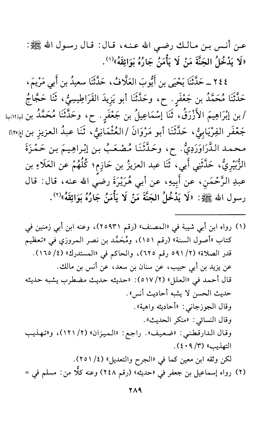 244 - حدثنا يحيى بن أيوب العلاف، حدثنا سعيد بن أبي مريم، حدثنا محمد بن جعفر. ح، وحدثنا أبو يزيد القراطيسي، ثنا حجاج بن إبراهيم الأزرق، ثنا إسماعيل بن جعفر. ح، وحدثنا محمد بن جعفر الفريابي، حدثنا أبو مروان العثماني، ثنا عبد العزيز بن محمد الدراوردي. ح، وحدثنا مصعب بن إبراهيم بن حمزة الزبيري، حدثني أبي، ثنا عبد العزيز بن حازم، كلهم عن العلاء بن عبد الرحمن، عن أبيه، عن أبي هريرة رضي الله عنه، قال: قال رسول الله صلى الله عليه وسلم: "لا يدخل الجنة من لا يأمن جاره بوائقه".