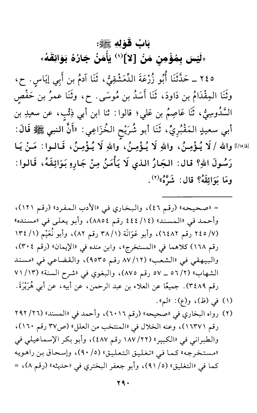 245 - حدثنا أبو زرعة الدمشقي، ثنا آدم بن أبي إياس. ح، وثنا المقدام بن داود، ثنا أسد بن موسى. ح، وثنا عمر بن حفص السدوسي، ثنا عاصم بن علي، قالوا: ثنا ابن أبي ذئب، عن سعيد بن أبي سعيد المقبري، ثنا أبو شريح الخزاعي:" أن النبي صلى الله عليه وسلم قال: والله لا يؤمن، والله لا يؤمن، والله لا يؤمن، قالوا: من يا رسول الله؟ قال: الجار الذي لا يأمن من جاره بوائقه، قالوا: وما بوائقه؟ قال: شره".