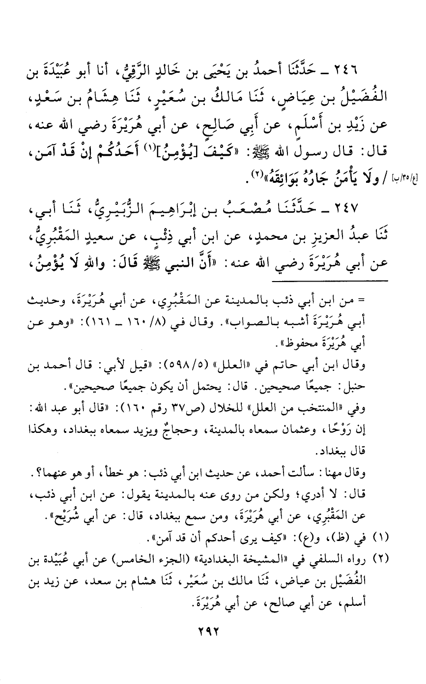 246 - حدثنا أحمد بن يحيى بن خالد الرقي، أنا أبو عبيدة بن الفضيل بن عياض، ثنا مالك بن سعير، ثنا هشام بن سعد، عن زيد بن أسلم، عن أبي صالح، عن أبي هريرة رضي الله عنه، قال: قال رسول الله صلى الله عليه وسلم: "كيف [يؤمن] أحدكم إن قد آمن، ولا يأمن جاره بوائقه".