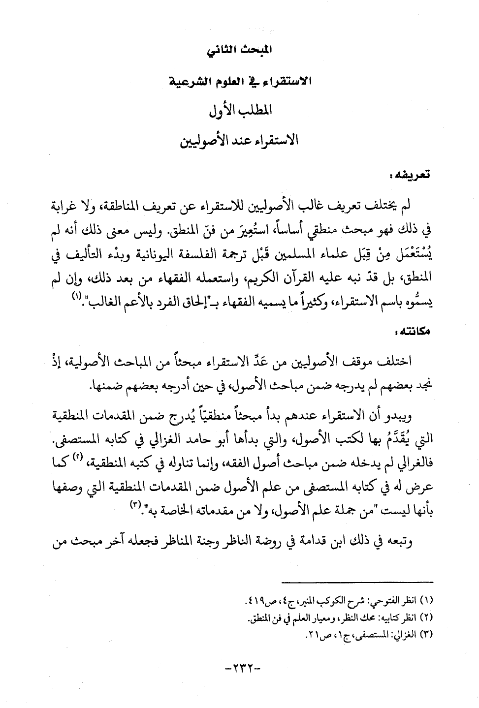 ويبدو أن الاستقراء عندهم بدأ مبحثًا منطقيًّا يُدرج ضمن المقدمات المنطقية التي يُقَدَّمُ بها لكتب الأصول، والتي بدأها أبو حامد الغزالي في كتابه المستصفى. فالغرالي لم يدخله ضمن مباحث أصول الفقه، وإنما تناوله في كتبه المنطقية، (¬2) كما عرض له في كتابه المستصفى من علم الأصول ضمن المقدمات المنطقية التي وصفها بأنها ليست "من جملة علم الأصول، ولا من مقدماته الخاصة به". (¬3)