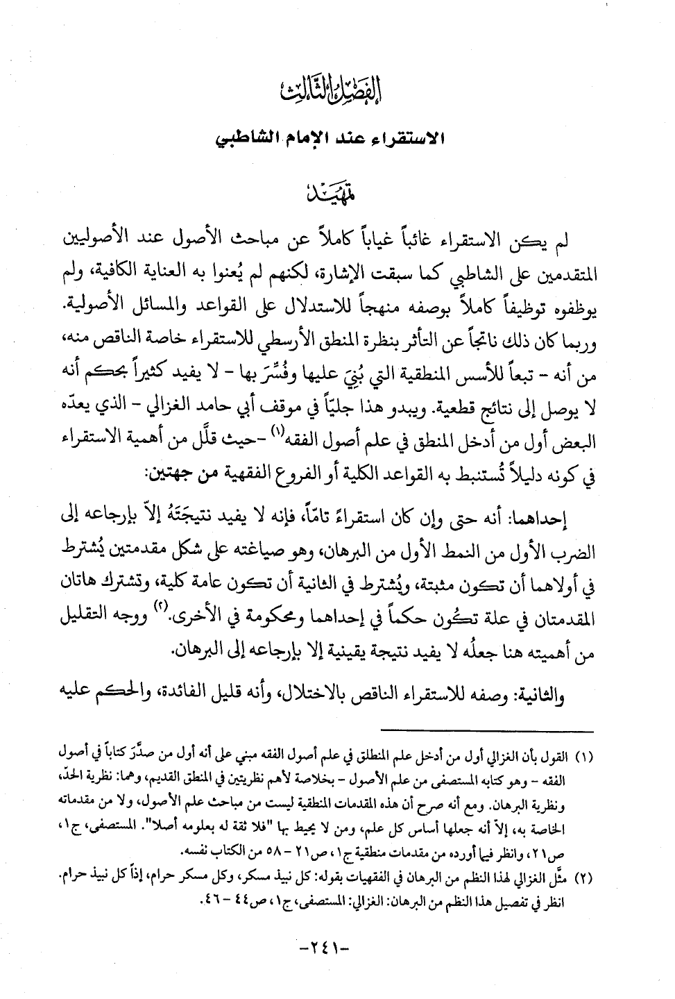 إحداهما: أنه حتى وإنكان استقراءً تامًّا، فإنه لا يفيد نتيجَتَهُ إلّا بإرجاعه إلى الضرب الأول من النمط الأول من البرهان، وهو صياغته على شكل مقدمتين يُشترط في أولاهما أن تكون مثبتة، ويُشترط في الثانية أن تكون عامة كلية، وتشترك هاتان المقدمتان في علة تكون حكمًا في إحداهما ومحكومة في الأخرى. (¬2) ووجه التقليل من أهميته هنا جعلُه لا يفيد نتيجة يقينية إلَّا بإرجاعه إلى البرهان.