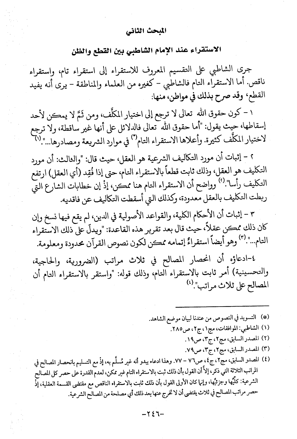 4 - ادعاؤه أن انحصار المصالح في ثلاث مراتب (الضرورية، والحاجية، والتحسينية) أمر ثابتًا بالاستقراء التام، وذلك قوله: "واستقر بالاستقراء التام أن المصالح على ثلاث مراتب". (¬4)