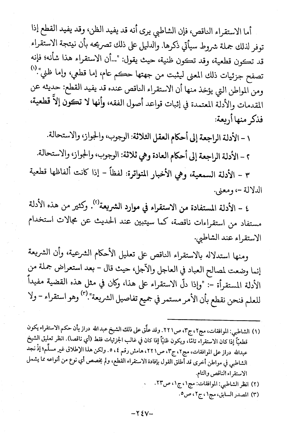 (¬1) الشاطبي: الموافقات، مج 2، ج 3، ص 221. وقد علَّق على ذلك الشيخ عبد الله دراز بأن حكم الاستقراء يكون قطعيًا إذا كان الاستقراء تامًّا، ويكون ظنيًا إذا كان في غالب الجزئيات فقط (أي ناقصا). انظر تعليق الشيخ عبد الله دراز على الموافقات، مج 2، ج 3، ص 221، هامش رقم 4، 5. ولكن هذا الإطلاق غير مسلَّم؛ إذْ نجد الشاطبي في مواطن أخرى قد أطلق القول بإفادة الاستقراء القطع، ولم يخصص أي نوع من أنواعه مما يشمل الاستقراء الناقص والتام.