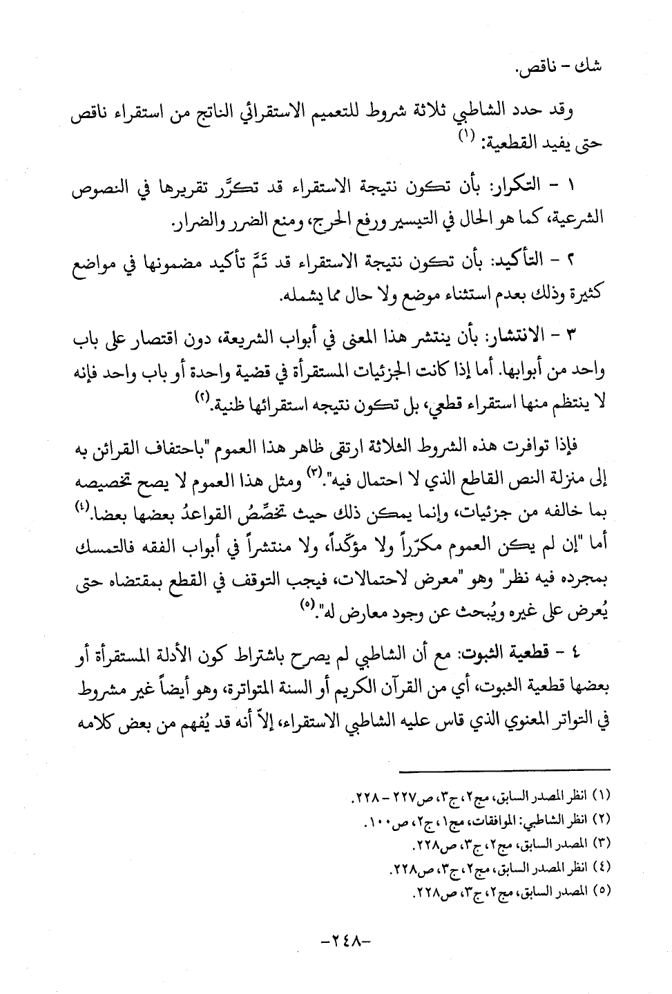 4 - قطعية الثبوت: مع أن الشاطبي لم يصرح باشتراط كون الأدلة المستقرأة أو بعضها قطعية الثبوت، أي من القرآن الكريم أو السنة المتواترة، وهو أيضًا غير مشروط في التواتر المعنوي الذي قاس عليه الشاطبي الاستقراء، إلّا أنه قد يُفهم من بعض كلامه