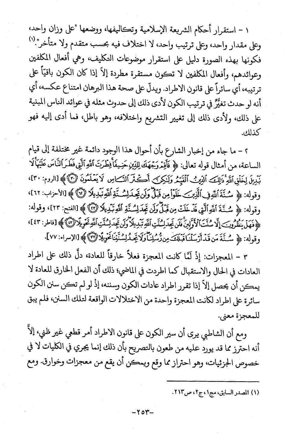 1 - استقرار أحكام الشريعة الإِسلامية وتكاليفها، ووضعها "على وزان واحد، وعلى مقدار واحد، وعلى ترتيب واحد، لا اختلاف فيه بحسب متقدم ولا متأخر". (¬1) فكونها بهذه الصورة دليل على استقرار موضوعات التكليف، وهي أفعال المكلفين وعوائدهم، وأفعال المكلفين لا تكون مستقرة مطردة إلّا إذا كان الكون باقيًّا على ترتيبه، أي سائرًا على قانون الإطراد. ويدلّ على صحة هذا البرهان امتناع عكسه، أي أنه لو حديث تغيُّرُ في ترتيب الكون لأدى ذلك إلى حدوث مثله في عوائد الناس المبنية على ذلك، ولأدى ذلك إلى تغيير التشريع واختلافه، وهو باطل، فما أدى إليه فهو كذلك.