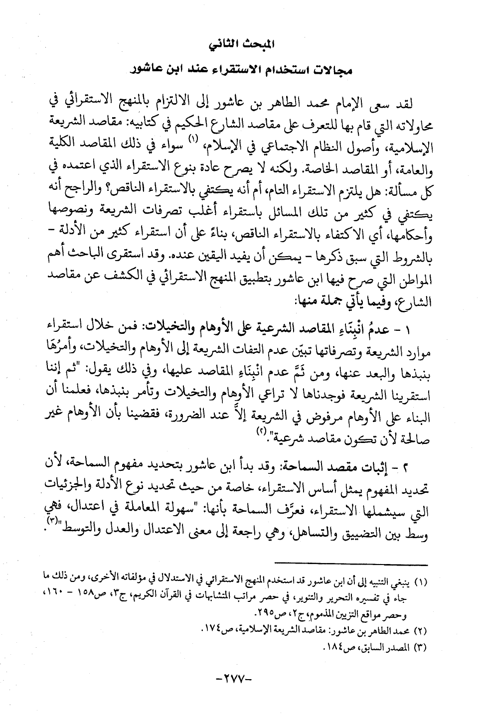 (¬1) ينبغي التنبيه إلى أن ابن عاشور قد استخدم المنهج الإستقرائي في الإستدلال في مؤلفاته الأخرى، ومن ذلك ما جاء في تفسيره التحرير والتنوير، في حصر مراتب المتشابهات في القرآن الكريم، ج 3، ص 158 - 160، وحصر مواقع التزيين المذموم، ج 2، ص 295.