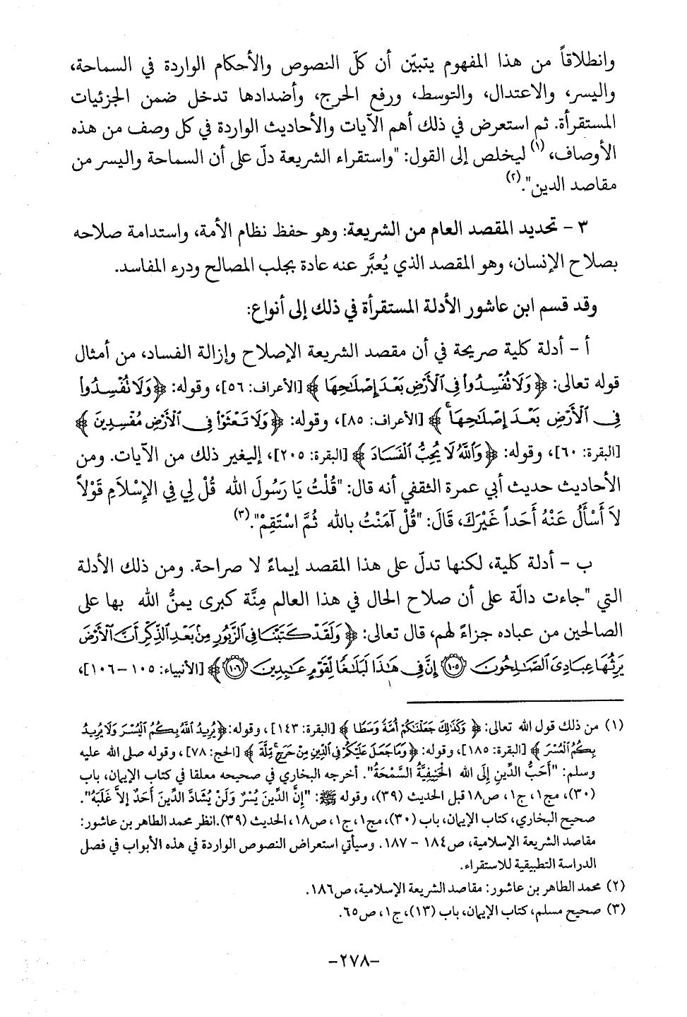 (¬1) من ذلك قول الله تعالى: {وَكَذَلِكَ جَعَلْنَاكُمْ أُمَّةً وَسَطًا} [البقرة: 143]، وقوله: {يُرِيدُ اللَّهُ بِكُمُ الْيُسْرَ وَلَا يُرِيدُ بِكُمُ الْعُسْرَ} [البقرة: 185]، وقوله: {وَمَا جَعَلَ عَلَيْكُمْ فِي الدِّينِ مِنْ حَرَجٍ مِلَّةَ} [الحج: 78]، وقوله صلى الله عليه وسلم: "أَحَبُ الدِّينِ إِلَى الله الْحَنِيفِيَّةُ السَّمْحَةُ". أخرجه البخاري في صحيحه معلقا في كتاب الإيمان، باب (30)، مج 1، ج 1، ص 18 قبل الحديث (39)، وقوله - صلى الله عليه وسلم -: "إِنَّ الدِّينَ يُسْرٌ وَلَنْ يُشَادَّ الدِّينَ أَحَدٌ إلَّا غَلَبَهُ". صحيح البخاري، كتاب الإيمان، باب (30)، مج 1، ج 1، ص 18، الحديث (39). انظر محمد الطاهر بن عاشور: مقاصد الشريعة الإِسلامية، ص 184 - 187. وسيأتي استعراض النصوص الواردة في هذه الأبواب في فصل الدراسة التطبيقية للإستقراء.