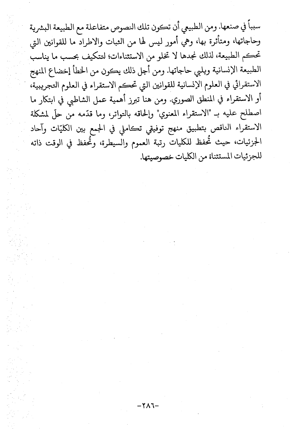 سببًا في صنعها. ومن الطبيعي أن تكون تلك النصوص متفاعلة مع الطبيعة البشرية وحاجاتها، ومتأثرة بها، وهي أمور ليس لها من الثبات والإطراد ما للقوانين التي تحكم الطبيعة، لذلك نجدها لا تخلو من الإستثناءات؛ لتتكيف بحسب ما يناسب الطبيعة الإنسانية ويلي حاجاتها. ومن أجل ذلك يكون من الخطأ إخضاع المنهج الإستقرائي في العلوم الإنسانية للقوانين التي تحكم الاستقراء في العلوم التجريبية، أو الاستقراء في المنطق الصوري. ومن هنا تبرز أهمية عمل الشاطبي في ابتكار ما اصطلح عليه بـ"الاستقراء المعنوي" وإلحاقه بالتواتر وما قدّمه من حلّ لمشكلة الاستقراء الناقص بتطبيق منهج توفيقي تكاملي في الجمع بين الكليّات وآحاد الجزئيات، حيث تُحفظ للكليات رتبة العموم والسيطرة، وتُحفظ في الوقت ذاته للجزئيات المستثناة من الكليات خصوصيتها.