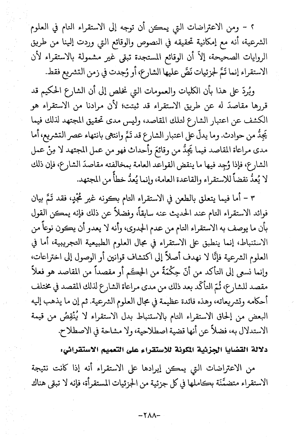 ويُردّ على هذا بأن الكليات والعمومات التي تخلص إلى أن الشارع الحكيم قد قررها مقاصدَ له عن طريق الاستقراء قد ثبتت؛ لأن مرادنا من الاستقراء هو الكشف عن اعتبار الشارع لتلك المقاصد، وليس مدى تحقيق المجتهد لذلك فيما يَجِدُّ من حوادث. وما يدلّ على اعتبار الشارع قد تَمَّ وانتهى بانتهاء عصر التشريع، أما مدى مراعاة المقاصد فيما يَجِدُّ من وقائَع وأحداث فهو من عمل المجتهد لا مِنْ عمل الشارع، فإذا وُجِد فيها ما ينقض القواعد العامة بمخالفت 5 مقاصدَ الشارع، فإن ذلك لا يُعدُّ نقضًا للإستقراء والقاعدة العامة، وإنما يُعدُّ خطأً من المجتهد.