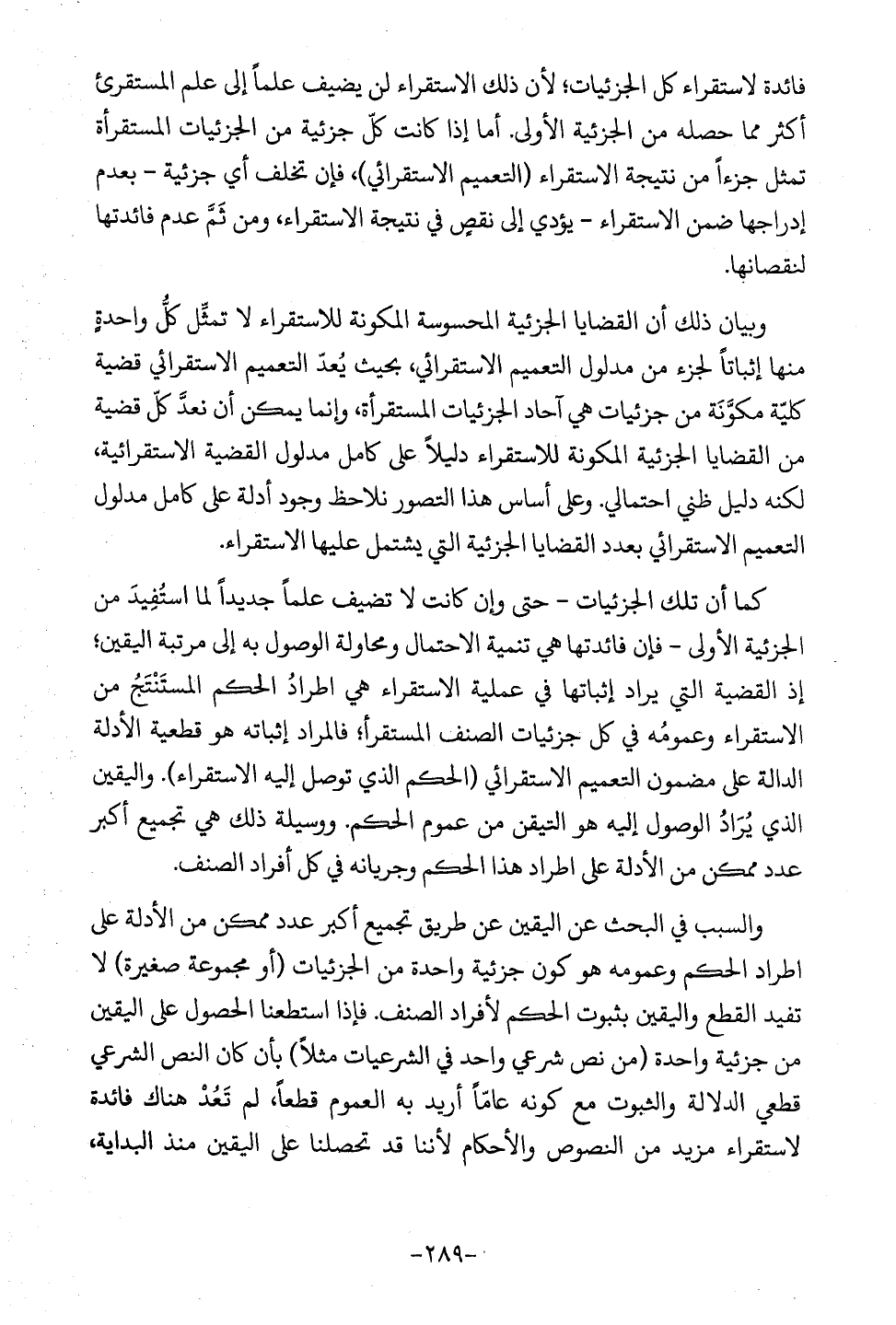 وبيان ذلك أن القضايا الجزئية المحسوسة المكونة للإستقراء لا تمثِّل كلُّ واحدةٍ منها إثباتًا لجزء من مدلول التعميم الإستقرائي، بحيث يُعدّ التعميم الإستقرائي قضية كليّة مكوَّنَة من جزئيات هي آحاد الجزئيات المستقرأة، وإنما يمكن أن نعدَّ كلّ قضية من القضايا الجزئية المكونة للإستقراء دليلًا على كامل مدلول القضية الإستقرائية، لكنه دليل ظني احتمالي. وعلى أساس هذا التصور نلاحظ وجود أدلة على كامل مدلول التعميم الإستقرائي بعدد القضايا الجزئية التي يشتمل عليها الاستقراء.