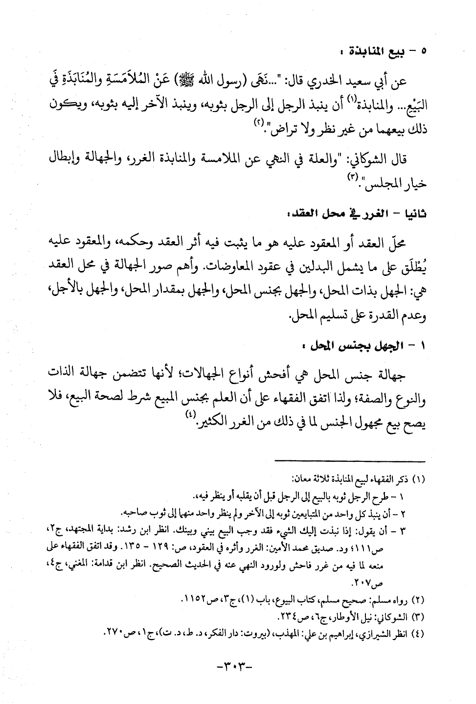 3 - أن يقول: إذا نبذت إليك الشيء فقد وجب البيع بيني وبينك. انظر ابن رشد: بداية المجتهد، ج 2، ص 111؛ ود. صديق محمد الأمين: الغرر وأثره في العقود، ص: 129 - 135. وقد اتفق الفقهاء على منعه لما فيه من غرر فاحش ولورود النهي عنه في الحديث الصحيح. انظر ابن قدامة: المغني، ج 4، ص 207.