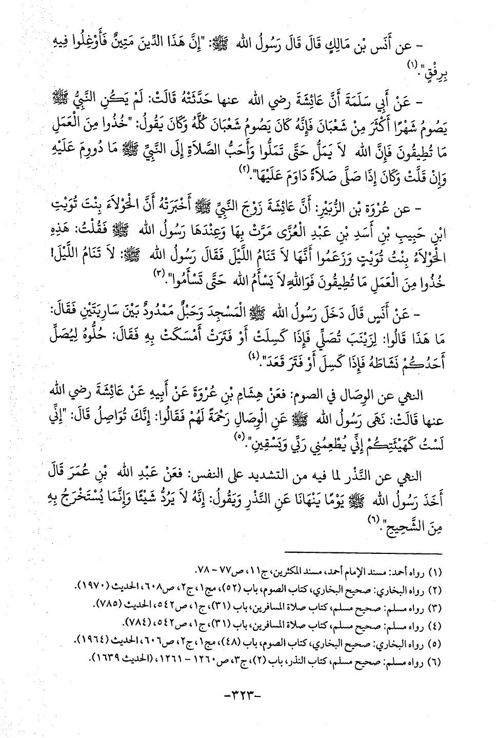 - عَنْ أَبِي سَلَمَةَ أَنَّ عَائِشَةَ - رضي الله عنها - حَدَّثَتْهُ قَالَتْ: لَمْ يَكُنِ النَّبِيُّ - صلى الله عليه وسلم - يَصُومُ شَهْرًا أَكْثَرَ مِنْ شَعبَانَ فَإِنَّهُ كَانَ يَصُومُ شَعْبَانَ كُلَّهُ وَكَانَ يَقُولُ: "خُذُوا مِنَ الْعَمَلِ مَا تُطِيقُونَ فَإِنَّ الله لَا يَمَلُّ حَتَّى تَمَلُّوا وَأَحَبُّ الصَّلَاةِ إِلَى النَّبِيِّ - صلى الله عليه وسلم - مَا دُووِمَ عَلَيْهِ وَإِنْ قَلَّتْ وَكَانَ إِذَا صَلَّى صَلاَةً دَاوَمَ عَلَيْهَا". (¬2)