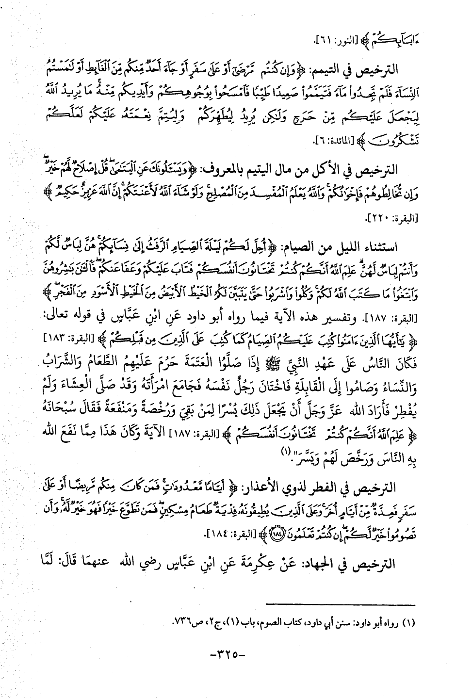 استثناء الليل من الصيام: {أُحِلَّ لَكُمْ لَيْلَةَ الصِّيَامِ الرَّفَثُ إِلَى نِسَائِكُمْ هُنَّ لِبَاسٌ لَكُمْ وَأَنْتُمْ لِبَاسٌ لَهُنَّ عَلِمَ اللَّهُ أَنَّكُمْ كُنْتُمْ تَخْتَانُونَ أَنْفُسَكُمْ فَتَابَ عَلَيْكُمْ وَعَفَا عَنْكُمْ فَالْآنَ بَاشِرُوهُنَّ وَابْتَغُوا مَا كَتَبَ اللَّهُ لَكُمْ وَكُلُوا وَاشْرَبُوا حَتَّى يَتَبَيَّنَ لَكُمُ الْخَيْطُ الْأَبْيَضُ مِنَ الْخَيْطِ الْأَسْوَدِ مِنَ الْفَجْرِ} [البقرة: 187]. وتفسير هذه الآية فيما رواه أبو داود عَنِ ابْنِ عَبَّاس في قوله تعالى: {يَاأَيُّهَا الَّذِينَ آمَنُوا كُتِبَ عَلَيْكُمُ الصِّيَامُ كَمَا كُتِبَ عَلَى الَّذِينَ مِنْ قَبْلِكُمْ} [البقرة: 183] فَكانَ النَّاسُ عَلَى عَهْدِ النّبِيِّ - صلى الله عليه وسلم - إِذَا صَلَّوُا الْعَتَمَةَ حَرُمَ عَلَيْهِمُ الطعَامُ وَالشَّرَابُ وَالنِّسَاءُ وَصَامُوا إِلَى الْقَابِلَةِ فَاخْتَانَ رَجُلٌ نَفْسَهُ فَجَامَعَ امْرَأَتَهُ وَقَد صَلَّى الْعِشَاءَ وَلَمْ يُفْطِر فَأَرَادَ الله -عَزَّ وَجَلَّ- أَنْ يَجْعَلَ ذَلِكَ يُسْرًا لِمَنْ بَقيَ وَرُخْصَةً ومَنْفَعَةً فَقَالَ سُبْحَانَهُ {عَلِمَ اللَّهُ أَنَّكُمْ كُنْتُمْ تَخْتَانُونَ أَنْفُسَكُمْ} [البقرة: 187] الآيَةَ وَكانَ هذَا مِمَّا نَفَعَ الله بِهِ النَّاسَ وَرَخَّصَ لَهُمْ وَيَسَّرَ" (¬1)