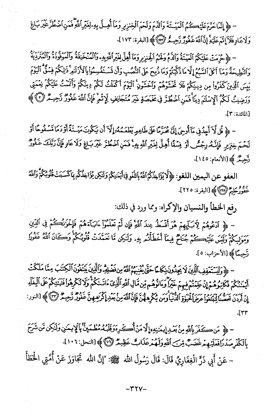 - {إِنَّمَا حَرَّمَ عَلَيْكُمُ الْمَيْتَةَ وَالدَّمَ وَلَحْمَ الْخِنْزِيرِ وَمَا أُهِلَّ بِهِ لِغَيْرِ اللهِ فَمَنِ اضْطُرَّ غَيْرَ بَاغٍ وَلَا عَادٍ فَلَا إِثْمَ عَلَيْهِ إِنَّ اللَّهَ غَفُورٌ رَحِيمٌ (173)} [البقرة: 173].