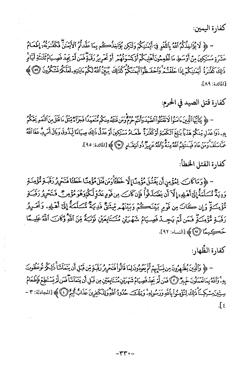- {لَا يُؤَاخِذُكُمُ اللَّهُ بِاللَّغْوِ فِي أَيْمَانِكُمْ وَلَكِنْ يُؤَاخِذُكُمْ بِمَا عَقَّدْتُمُ الْأَيْمَانَ فَكَفَّارَتُهُ إِطْعَامُ عَشَرَةِ مَسَاكِينَ مِنْ أَوْسَطِ مَا تُطْعِمُونَ أَهْلِيكُمْ أَوْ كِسْوَتُهُمْ أَوْ تَحْرِيرُ رَقَبَةٍ فَمَنْ لَمْ يَجِدْ فَصِيَامُ ثَلَاثَةِ أَيَّامٍ ذَلِكَ كَفَّارَةُ أَيْمَانِكُمْ إِذَا حَلَفْتُمْ وَاحْفَظُوا أَيْمَانَكُمْ كَذَلِكَ يُبَيِّنُ اللَّهُ لَكُمْ آيَاتِهِ لَعَلَّكُمْ تَشْكُرُونَ (89)} [المائدة: 89].