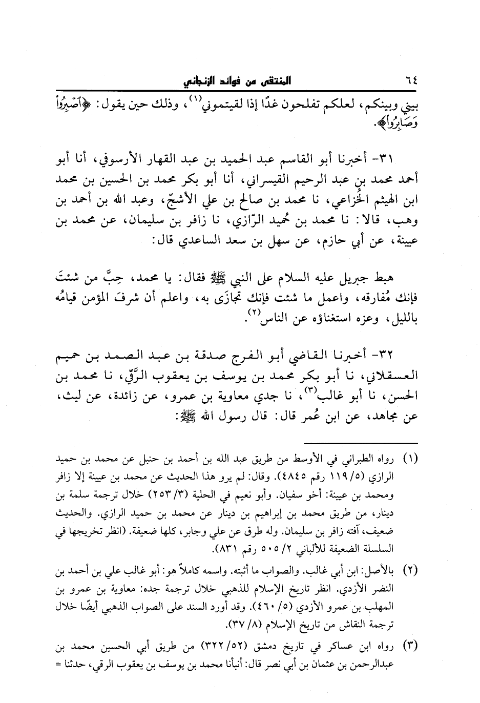 32 - أخبرنا القاضي أبو الفرج صدقة بن عبد الصمد بن حميم العسقلاني، نا أبو بكر محمد بن يوسف بن يعقوب الرقي، نا محمد بن الحسن، نا أبو غالب، نا جدي معاوية بن عمرو، عن زائدة، عن ليث، عن مجاهد، عن ابن عمر قال: قال رسول الله صلى الله عليه وسلم: