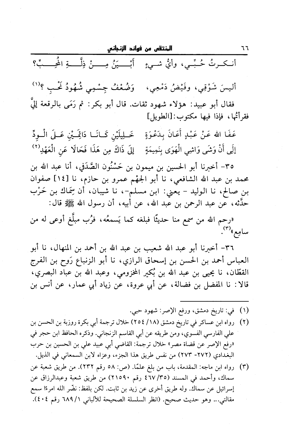36 - أخبرنا أبو عبد الله شعيب بن عبد الله بن أحمد بن المنهال، نا أبو العباس أحمد بن الحسن بن إسحاق الرازي، نا أبو الزنباع روح بن الفرج القطان، نا يحيى بن عبد الله بن بكير المخزومي، وعبد الله بن عباد البصري، قالا: نا المفضل بن فضالة، عن أبي عروة، عن زياد أبي عمار، عن أنس بن #67# مالك قال: سمعت رسول الله صلى الله عليه وسلم يقول:
