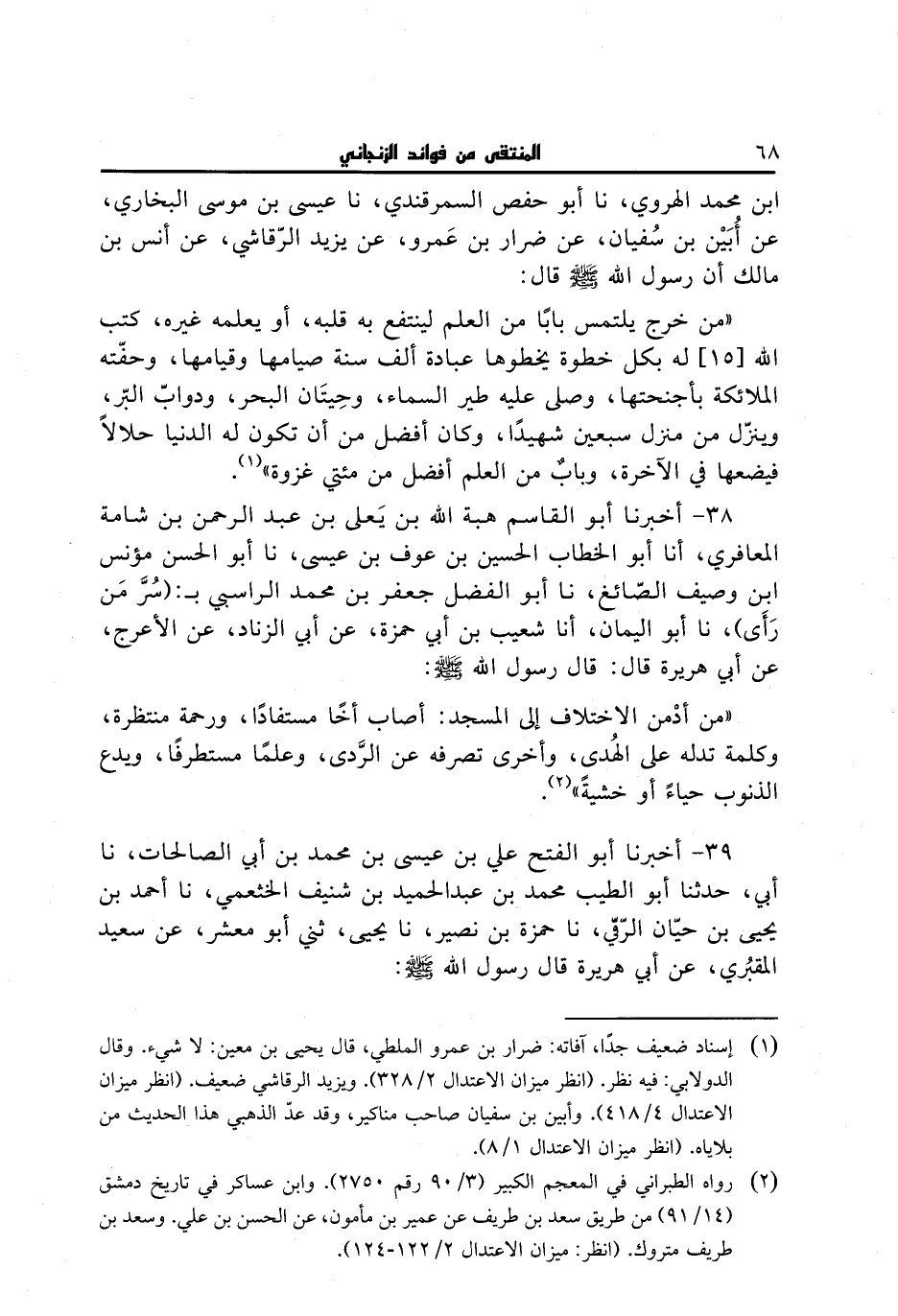 38 - أخبرنا أبو القاسم هبة الله بن يعلى بن عبد الرحمن بن شامة المعافري، أنا أبو الخطاب الحسين بن عوف بن عيسى، نا أبو الحسن مؤنس بن وصيف الصائغ، نا أبو الفضل جعفر بن محمد الراسبي بـ: (سر من رأى)، نا أبو اليمان، أنا شعيب بن أبي حمزة، عن أبي الزناد، عن الأعرج، عن أبي هريرة قال: قال رسول الله صلى الله عليه وسلم: