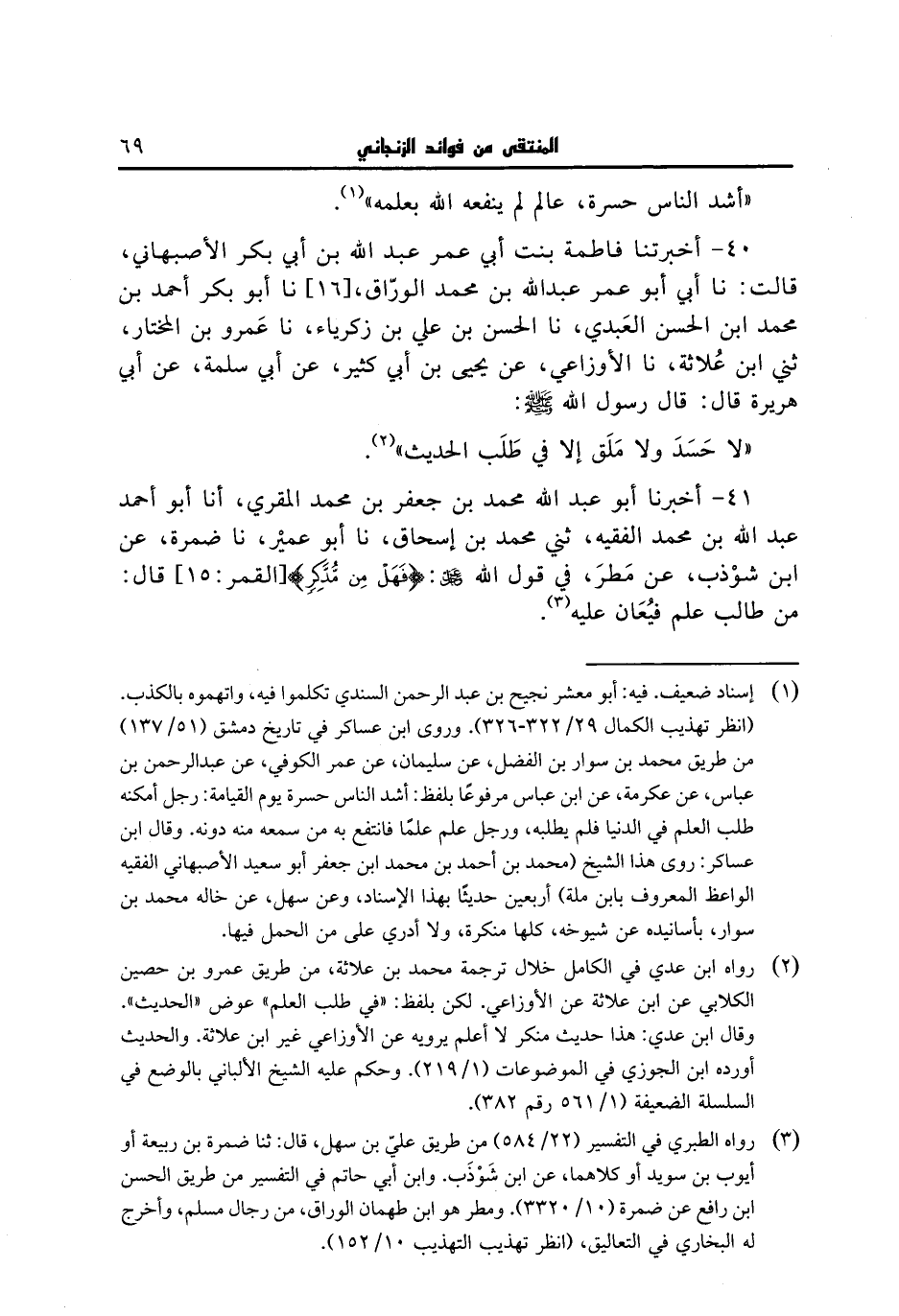 40 - أخبرتنا فاطمة بنت أبي عمر عبد الله بن أبي بكر الأصبهاني، قالت: نا أبي أبو عمر عبد الله بن محمد الوراق، نا أبو بكر أحمد بن محمد ابن الحسن العبدي، نا الحسن بن علي بن زكرياء، نا عمرو بن المختار، ثني ابن علاثة، نا الأوزاعي، عن يحيى بن أبي كثير، عن أبي سلمة، عن أبي هريرة قال: قال رسول الله صلى الله عليه وسلم: