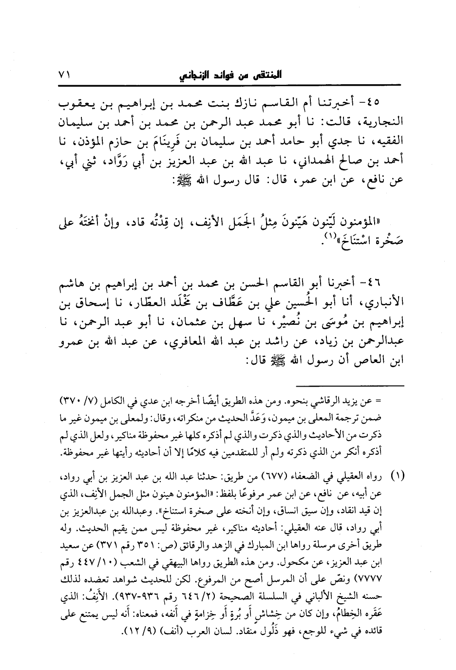 45 - أخبرتنا أم القاسم نازك بنت محمد بن إبراهيم بن يعقوب النجارية، قالت: نا أبو محمد عبد الرحمن بن محمد بن أحمد بن سليمان الفقيه، نا جدي أبو حامد أحمد بن سليمان بن فرينام بن حازم المؤذن، نا أحمد بن صالح الهمداني، نا عبد الله بن عبد العزيز بن أبي رواد، ثني أبي، عن نافع، عن ابن عمر، قال: قال رسول الله صلى الله عليه وسلم: