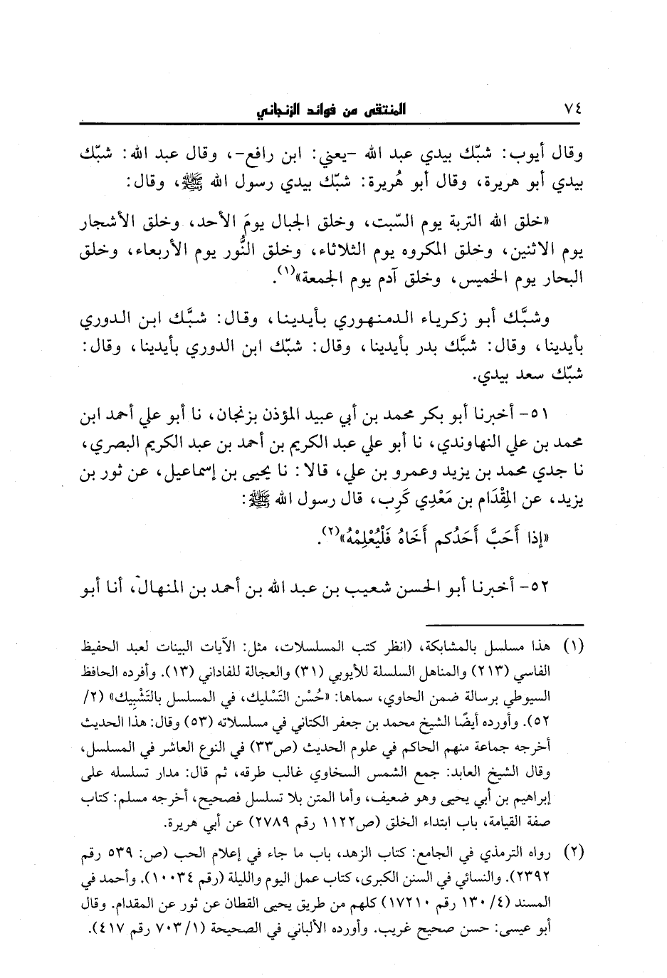 51 - أخبرنا أبو بكر محمد بن أبي عبيد المؤذن بزنجان، نا أبو علي أحمد بن محمد بن علي النهاوندي، نا أبو علي عبد الكريم بن أحمد بن عبد الكريم البصري، نا جدي محمد بن يزيد وعمرو بن علي، قالا: نا يحيى بن إسماعيل، عن ثور بن يزيد، عن المقدام بن معدي كرب، قال رسول الله صلى الله عليه وسلم: