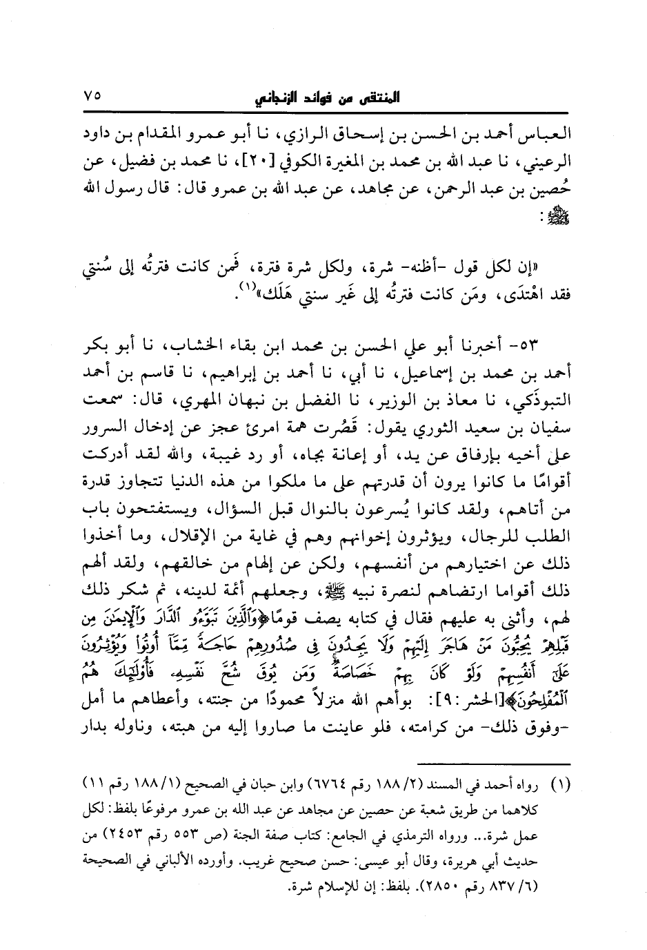 53 - أخبرنا أبو علي الحسن بن محمد بن بقاء الخشاب، نا أبو بكر أحمد بن محمد بن إسماعيل، نا أبي، نا أحمد بن إبراهيم، نا قاسم بن أحمد التبوذكي، نا معاذ بن الوزير، نا الفضل بن نبهان المهري، قال: سمعت سفيان بن سعيد الثوري يقول: قصرت همة امرئ عجز عن إدخال السرور على أخيه بإرفاق عن يد، أو إعانة بجاه، أو رد غيبة، والله لقد أدركت أقواما ما كانوا يرون أن قدرتهم على ما ملكوا من هذه الدنيا تتجاوز قدرة من أتاهم، ولقد كانوا يسرعون بالنوال قبل السؤال، ويستفتحون باب الطلب للرجال، ويؤثرون إخوانهم وهم في غاية من الإقلال، وما أخذوا ذلك عن اختيارهم من أنفسهم، ولكن عن إلهام من خالقهم، ولقد ألهم ذلك أقواما ارتضاهم لنصرة نبيه صلى الله عليه وسلم، وجعلهم أئمة لدينه، ثم شكر ذلك لهم، وأثنى به عليهم فقال في كتابه يصف قوما {والذين تبوءوا الدار والإيمان من قبلهم يحبون من هاجر إليهم ولا يجدون في صدورهم حاجة مما أوتوا ويؤثرون على أنفسهم ولو كان بهم خصاصة ومن يوق شح نفسه فأولئك هم المفلحون} بوأهم الله منزلا محمودا من جنته، وأعطاهم ما أمل -وفوق ذلك- من كرامته، فلو عاينت ما صاروا إليه من هبته، وناوله بدار #76# الخلد من فضل نعمته لأعملت نفسك في الازدياد من طاعته، ولعطفتها على ما يقرب من محبته وصدق رسول الله صلى الله عليه وسلم [إذ] يقول: ((إن من الشعر حكمة)). أنشدني بعض الشعراء: [الخفيف].
