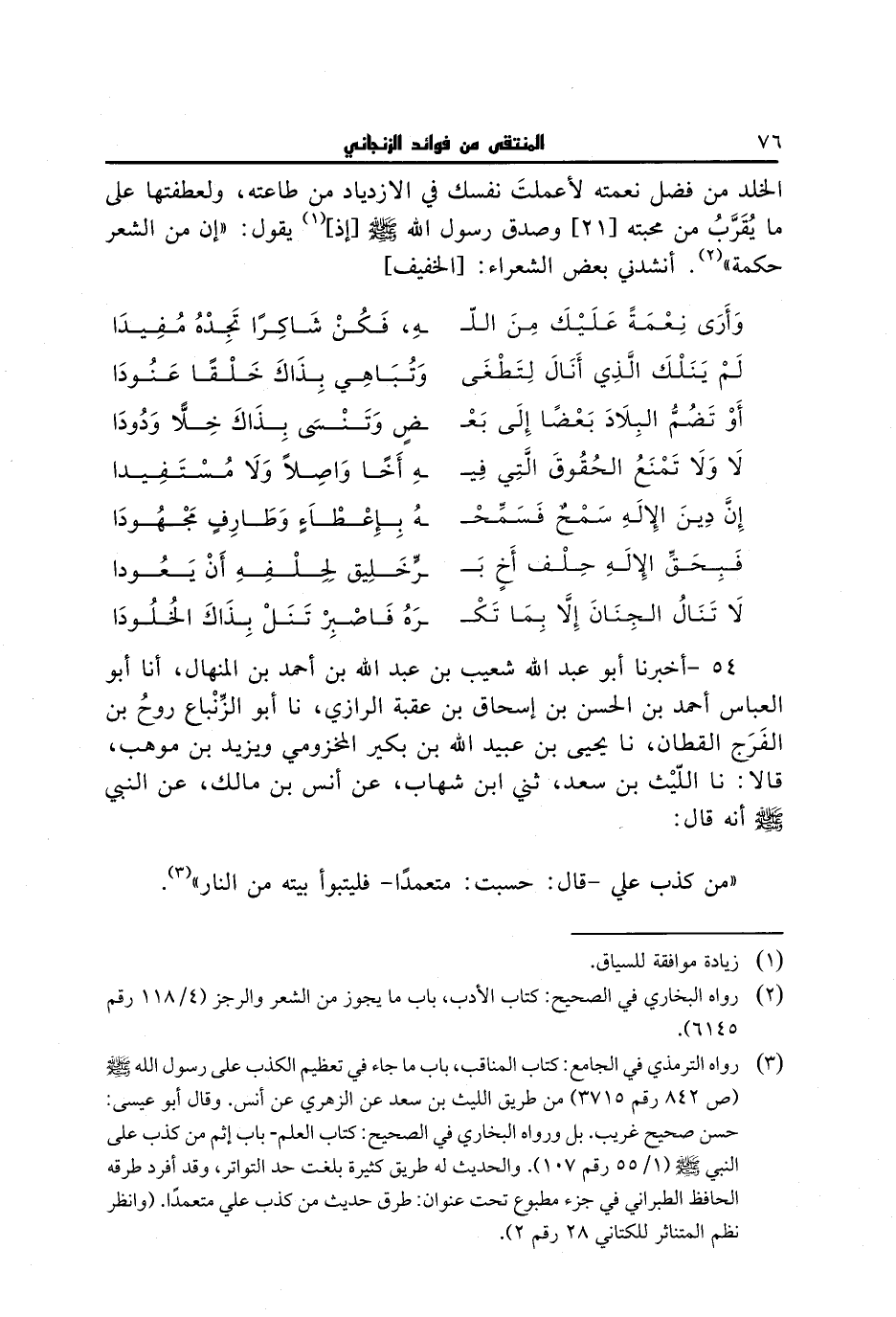 54 - أخبرنا أبو عبد الله شعيب بن عبد الله بن أحمد بن المنهال، أنا أبو العباس أحمد بن الحسن بن إسحاق بن عقبة الرازي، نا أبو الزنباع روح بن الفرج القطان، نا يحيى بن عبيد الله بن بكير المخزومي ويزيد بن موهب، قالا: نا الليث بن سعد، ثني ابن شهاب، عن أنس بن مالك، عن النبي صلى الله عليه وسلم أنه قال: