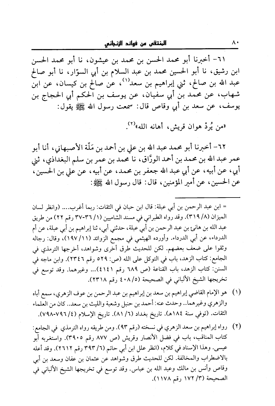 61 - أخبرنا أبو محمد الحسن بن محمد بن عيشون، نا أبو محمد الحسن بن رشيق، نا أبو الحسين محمد بن عبد السلام بن أبي السوار، نا أبو صالح عبد الله بن صالح، ثني إبراهيم بن سعد، عن صالح بن كيسان، عن ابن شهاب، عن محمد بن أبي سفيان، عن يوسف بن الحكم أبي الحجاج بن يوسف، عن سعد بن أبي وقاص قال: سمعت رسول الله صلى الله عليه وسلم يقول:
