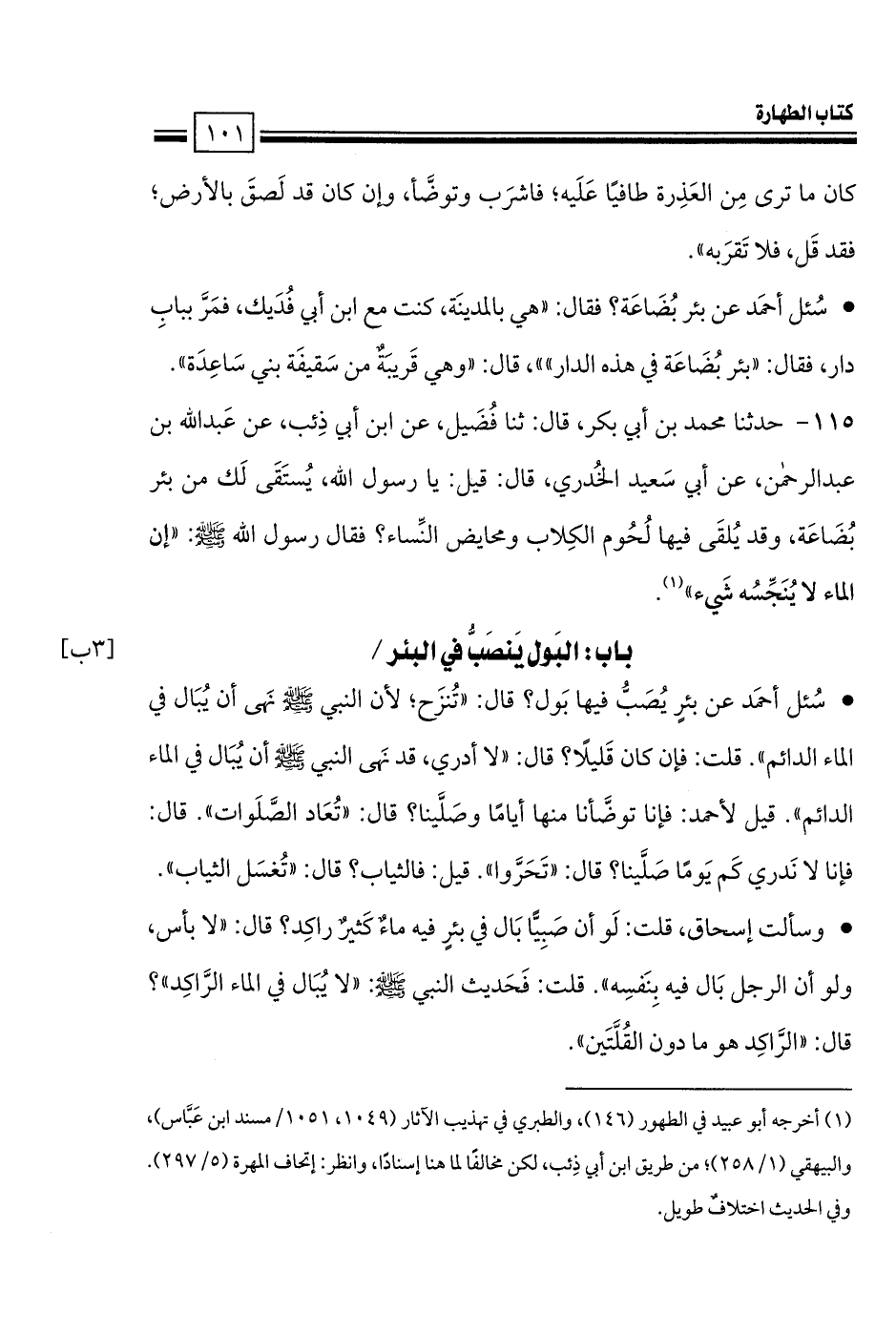 • سُئل أحمَد عن بئرٍ يُصَبُّ فيها بَول؟ قال: «تُنزَح؛ لأن النبي صلى الله عليه وسلم نَهى أن يُبَال في الماء الدائم». قلت: فإن كان قَليلًا؟ قال: «لا أدري، قد نَهى النبي صلى الله عليه وسلم أن يُبَال في الماء الدائم». قيل لأحمد: فإنا توضَّأنا منها أيامًا وصَلَّينا؟ قال: «تُعَاد الصَّلَوات». قال: فإنا لا نَدري كَم يَومًا صَلَّينا؟ قال: «تَحَرَّوا». قيل: فالثياب؟ قال: «تُغسَل الثياب».