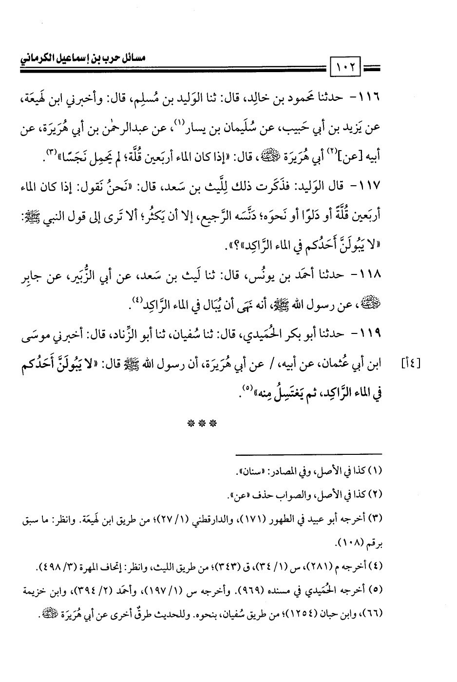 117 - قال الوَليد: فذَكَرت ذلك لِلَّيث بن سَعد، قال: «نَحنُ نَقول: إذا كان الماء أربَعين قُلَّةً أو دَلوًا أو نَحوَه؛ دَنَّسَه الرَّجيع، إلا أن يَكثُر؛ ألا تَرى إلى قول النبي صلى الله عليه وسلم: «لا يَبُولَنَّ أَحَدُكم في الماء الرَّاكِد»؟».