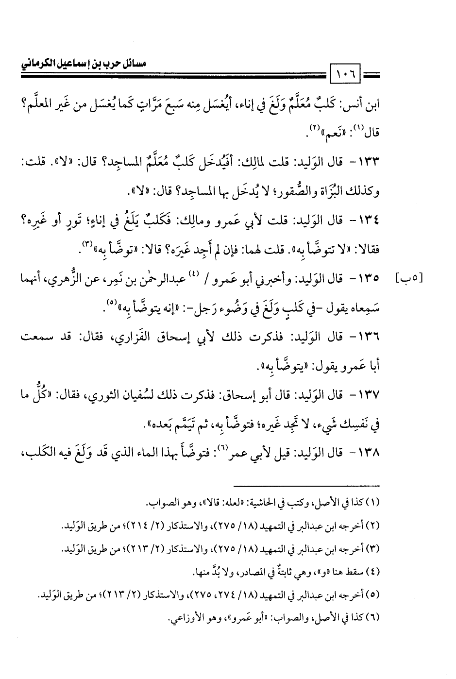 135 - قال الوَليد: وأخبرني أبو عَمرو (1) عبد الرحمن بن نَمِر، عن الزُّهري، أنهما سَمِعاه يقول -في كَلبٍ وَلَغَ في وَضُوء رَجل-: «إنه يتوضَّأ بِه».