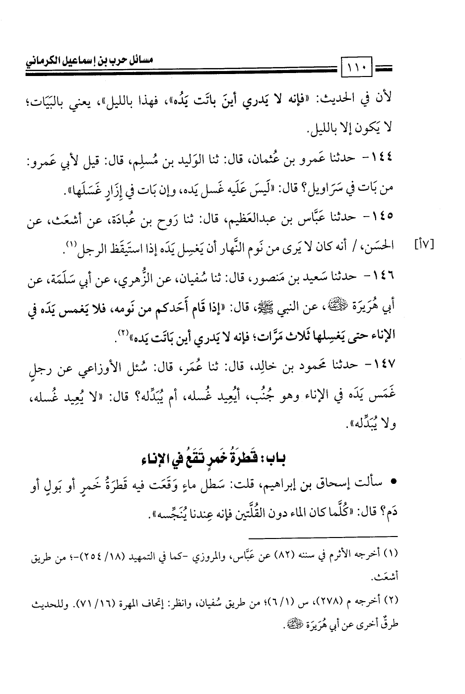 144 - حدثنا عَمرو بن عُثمان، قال: ثنا الوَليد بن مُسلِم، قال: قيل لأبي عَمرو: من بَات في سَرَاويل؟ قال: «لَيسَ عَلَيه غَسل يَده، وإن بَات في إِزَارٍ غَسَلَها».