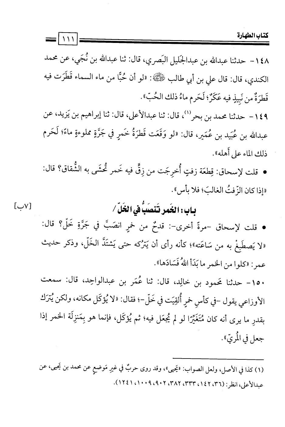149 - حدثنا محمد بن بحر (1)، قال: ثنا عبد الأعلى، قال: ثنا إبراهيم بن يَزيد، عن عبد الله بن عُبَيد بن عُمَير، قال: «لو وَقَعَت قَطرَةُ خَمرٍ في جَرَّةٍ مملوءةٍ ماءً؛ لَحَرم ذلك الماء على أَهله».
