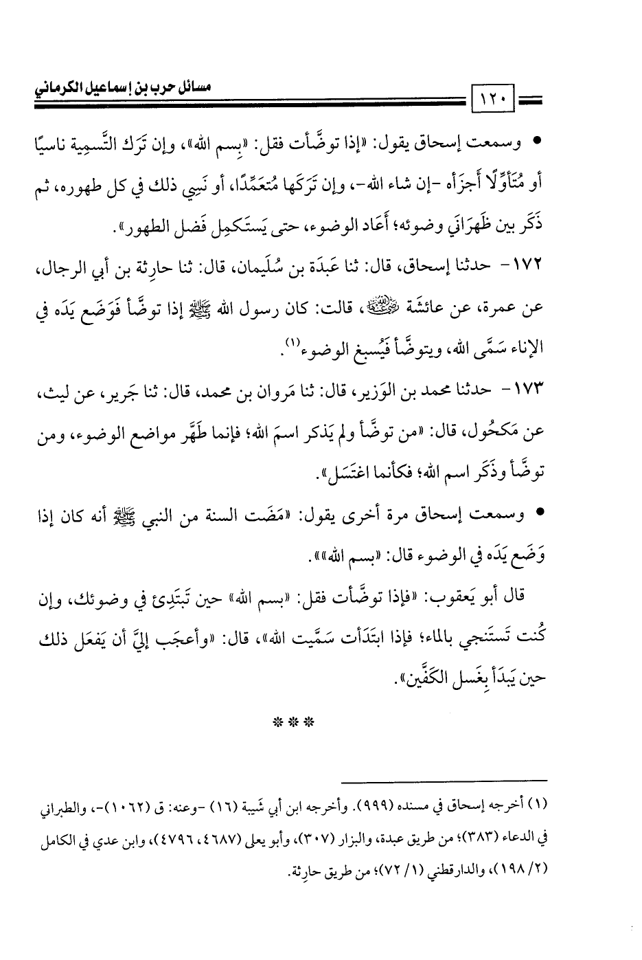 • وسمعت إسحاق مرة أخرى يقول: «مَضَت السنة من النبي صلى الله عليه وسلم أنه كان إذا وَضَع يَدَه في الوضوء قال: «بسم الله»».