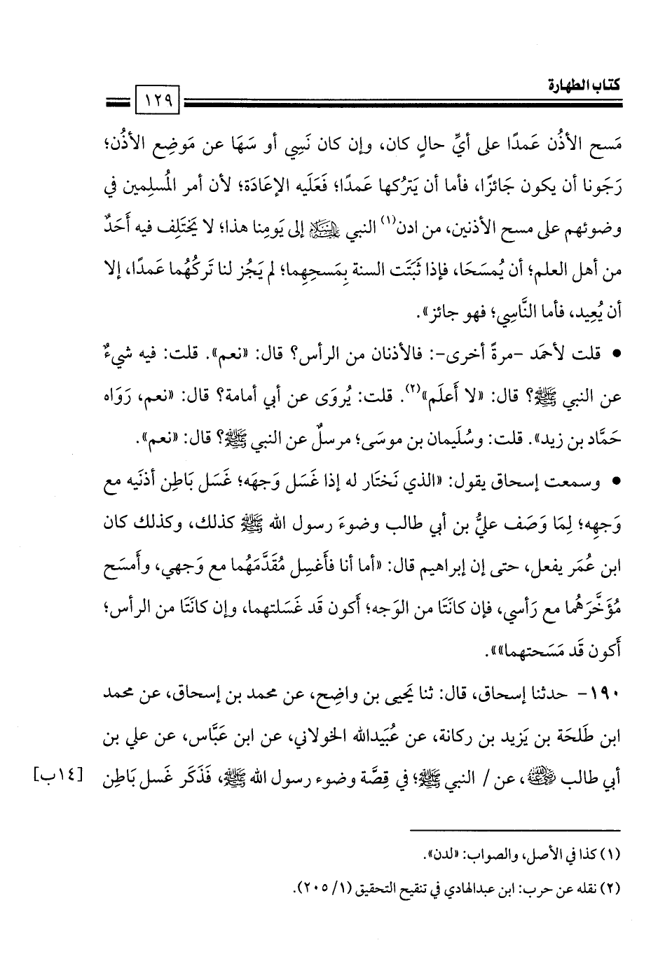 • وسمعت إسحاق يقول: «الذي نَختَار له إذا غَسَل وَجهَه؛ غَسَل بَاطِن أذنَيه مع وَجهِه؛ لِمَا وَصَف عليُّ بن أبي طالب وضوءَ رسول الله صلى الله عليه وسلم كذلك، وكذلك كان ابن عُمَر يفعل، حتى إن إبراهيم قال: «أما أنا فأَغسِل مُقَدَّمَهُما مع وَجهي، وأَمسَح مُؤَخَّرَهُما مع رَأسي، فإن كانَتَا من الوَجه؛ أَكون قَد غَسَلتهما، وإن كانَتَا من الرأس؛ أَكون قَد مَسَحتهما»».