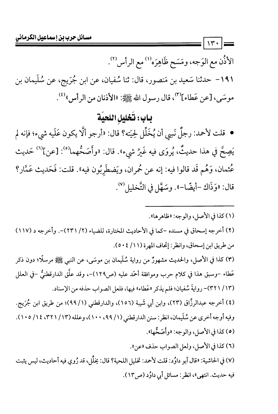 (1) كذا في الأصل، والحديث مشهور من رواية سليمان بن موسى، عن النبي صلى الله عليه وسلم مرسلا، دون ذكر عطاء -وسبق هذا في كلام حرب وموافقة أحمد عليه (ص 129) -، وقد علق الدارقطني -في العلل (13/ 321) - رواية سفيان، فلم يذكر "عطاء" فيها، فلعل الصواب حذفه من الإسناد.
