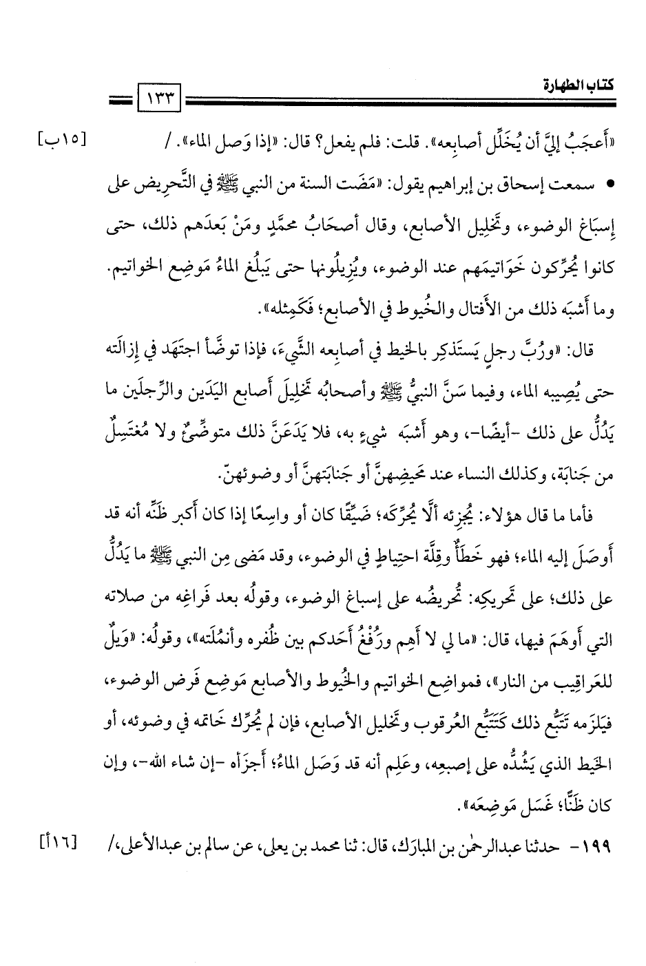 إِسبَاغ الوضوء، وتَخلِيل الأصابع، وقال أصحَابُ محمَّدٍ ومَنْ بَعدَهم ذلك، حتى كانوا يُحرِّكون خَوَاتيمَهم عند الوضوء، ويُزِيلُونها حتى يَبلُغ الماءُ مَوضِع الخواتيم. وما أَشبَه ذلك من الأَفتال والخُيوط في الأصابع؛ فَكَمِثله».