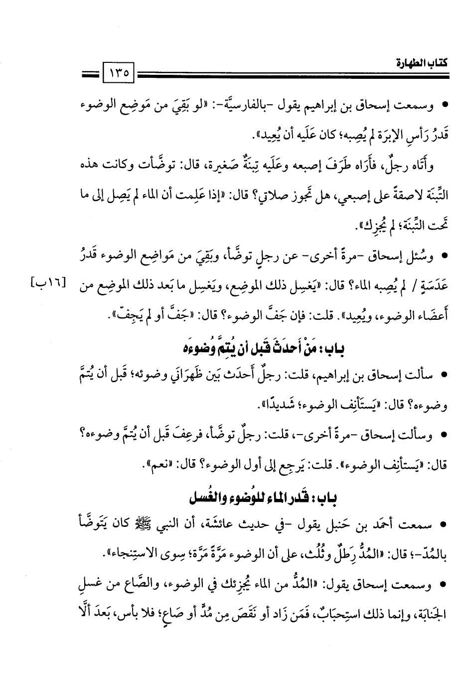 • سألت إسحاق بن إبراهيم، قلت: رجلٌ أَحدَث بَين ظَهرَانَي وضوئه؛ قَبل أن يُتمَّ وضوءه؟ قال: «يَستَأنِف الوضوء؛ شَديدًا».