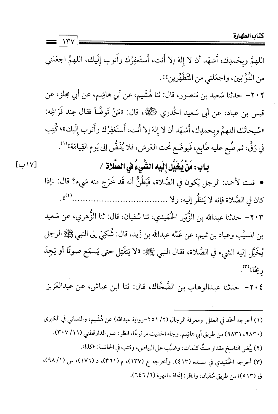 203 - حدثنا عبد الله بن الزُّبَير الحُمَيدي، ثنا سُفيان، قال: ثنا الزُّهري، عن سَعيد بن المسيَّب وعباد بن تميم، عن عَمِّه عبد الله بن زَيد، قال: شُكِيَ إلى النبي صلى الله عليه وسلم الرجل يُخَيَّل إليه الشيء في الصَّلاة، فقال النبي صلى الله عليه وسلم: «لا يَنفَتِل حتى يَسمَع صوتًا أو يَجِدَ رِيحًا».