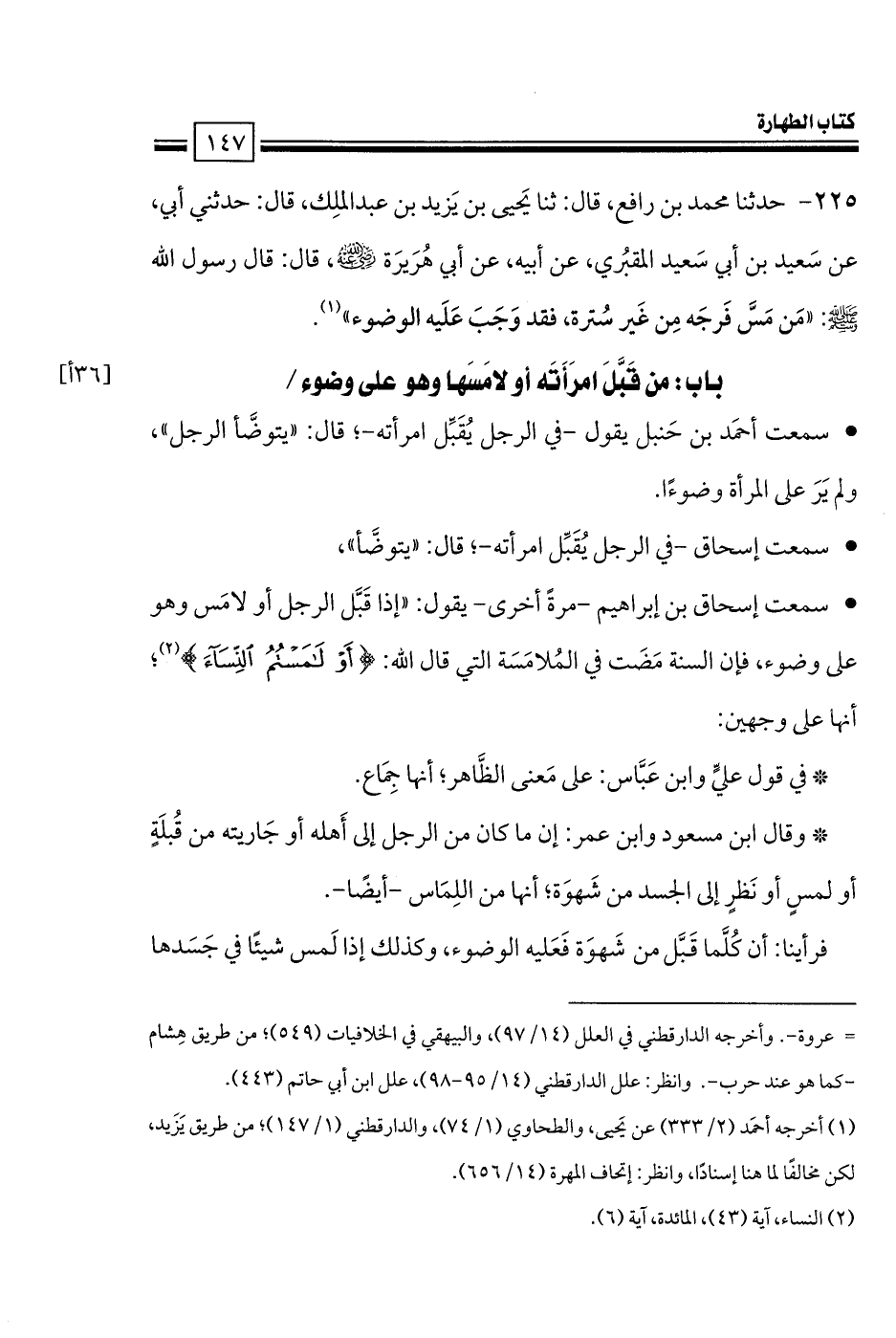 • سمعت إسحاق بن إبراهيم -مرةً أخرى- يقول: «إذا قَبَّل الرجل أو لامَس وهو على وضوء، فإن السنة مَضَت في المُلامَسَة التي قال الله: {أو لامستم النساء}؛ أنها على وجهين: