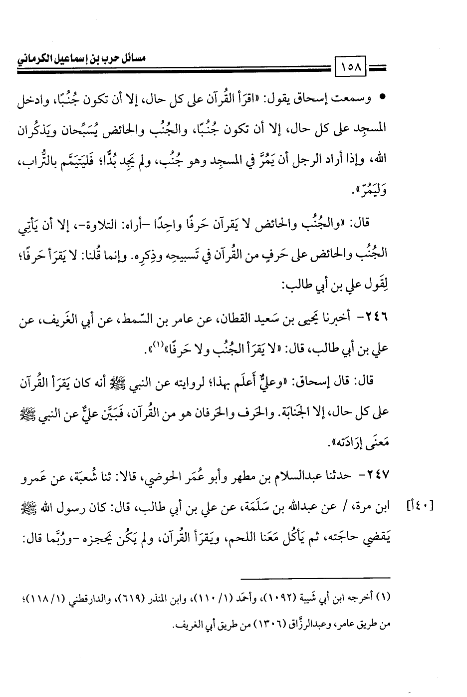246 - أخبرنا يَحيى بن سَعيد القطان، عن عامر بن السّمط، عن أبي الغَريف، عن علي بن أبي طالب، قال: «لا يَقرَأ الجُنُب ولا حَرفًا»».