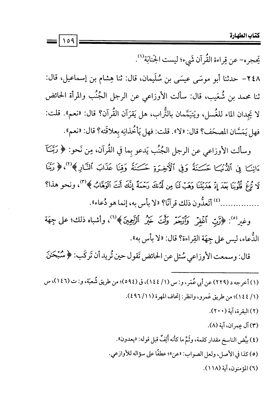 وسألت الأوزاعي عن الرجل الجُنُب يَدعو بِما في القُرآن، مِن نَحو: {ربنا آتنا في الدنيا حسنة وفي الآخرة حسنة وقنا عذاب النار}، {ربنا لا تزغ قلوبنا بعد إذ هديتنا وهب لنا من لدنك رحمة إنك أنت الوهاب}، ونحو هذا؟ ............... (1) أتَعدُّون ذلك قرآنًا؟ «لا بأس به، إنما هو دُعاء».
