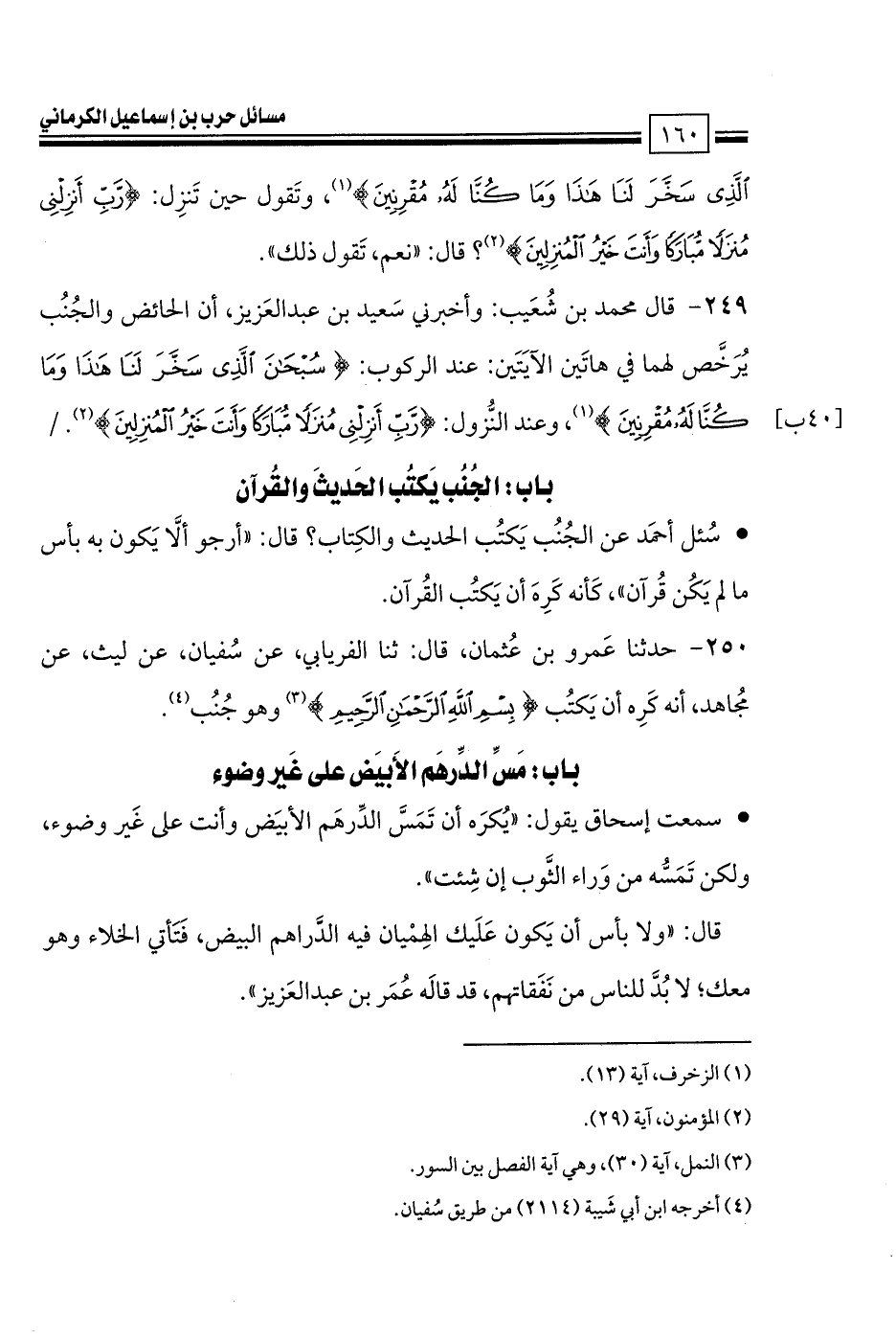 • سُئل أحمَد عن الجُنُب يَكتُب الحديث والكِتاب؟ قال: «أرجو ألَّا يَكون به بأس ما لم يَكُن قُرآن»، كَأنه كَرِهَ أن يَكتُب القُرآن.