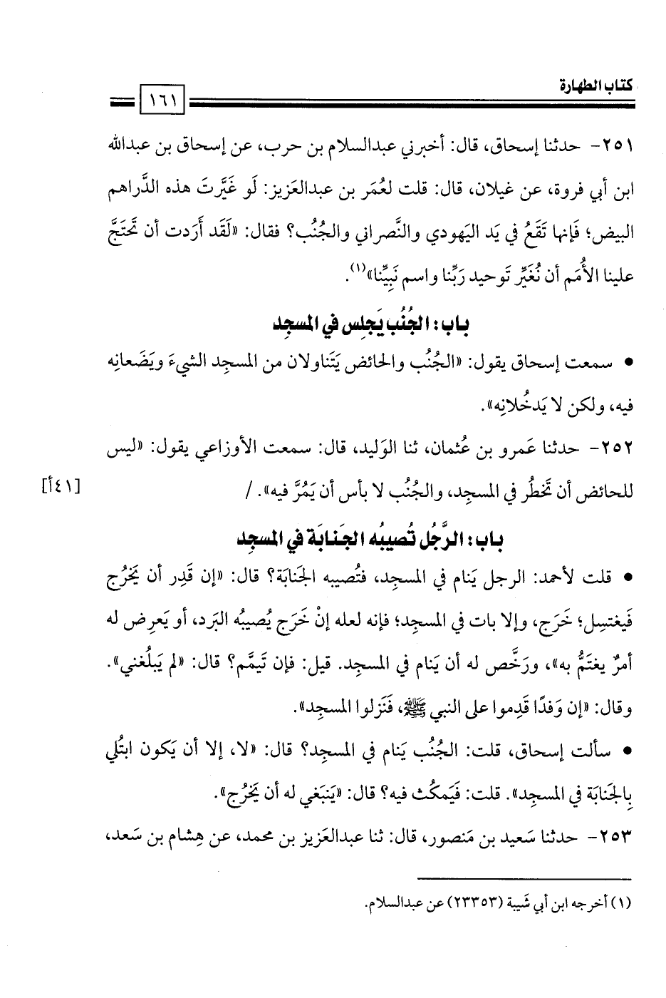 • سألت إسحاق، قلت: الجُنُب يَنام في المسجِد؟ قال: «لا، إلا أن يَكون ابتُلي بِالجَنابَة في المسجِد». قلت: فَيَمكُث فيه؟ قال: «يَنبَغي له أن يَخرُج».