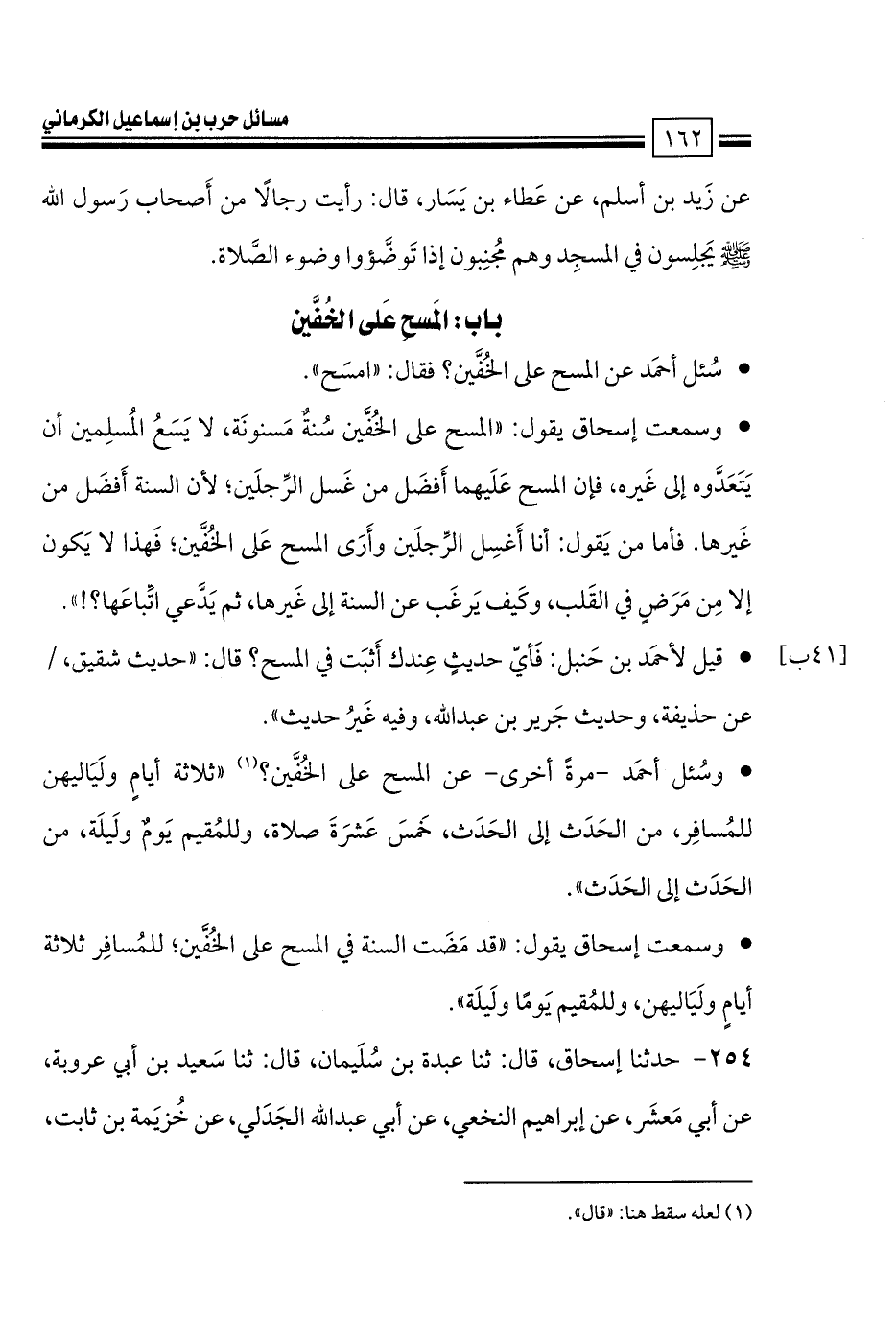 • وسمعت إسحاق يقول: «قد مَضَت السنة في المسح على الخُفَّين؛ للمُسافِر ثلاثة أيامٍ ولَيَاليهن، وللمُقيم يَومًا ولَيلَة».