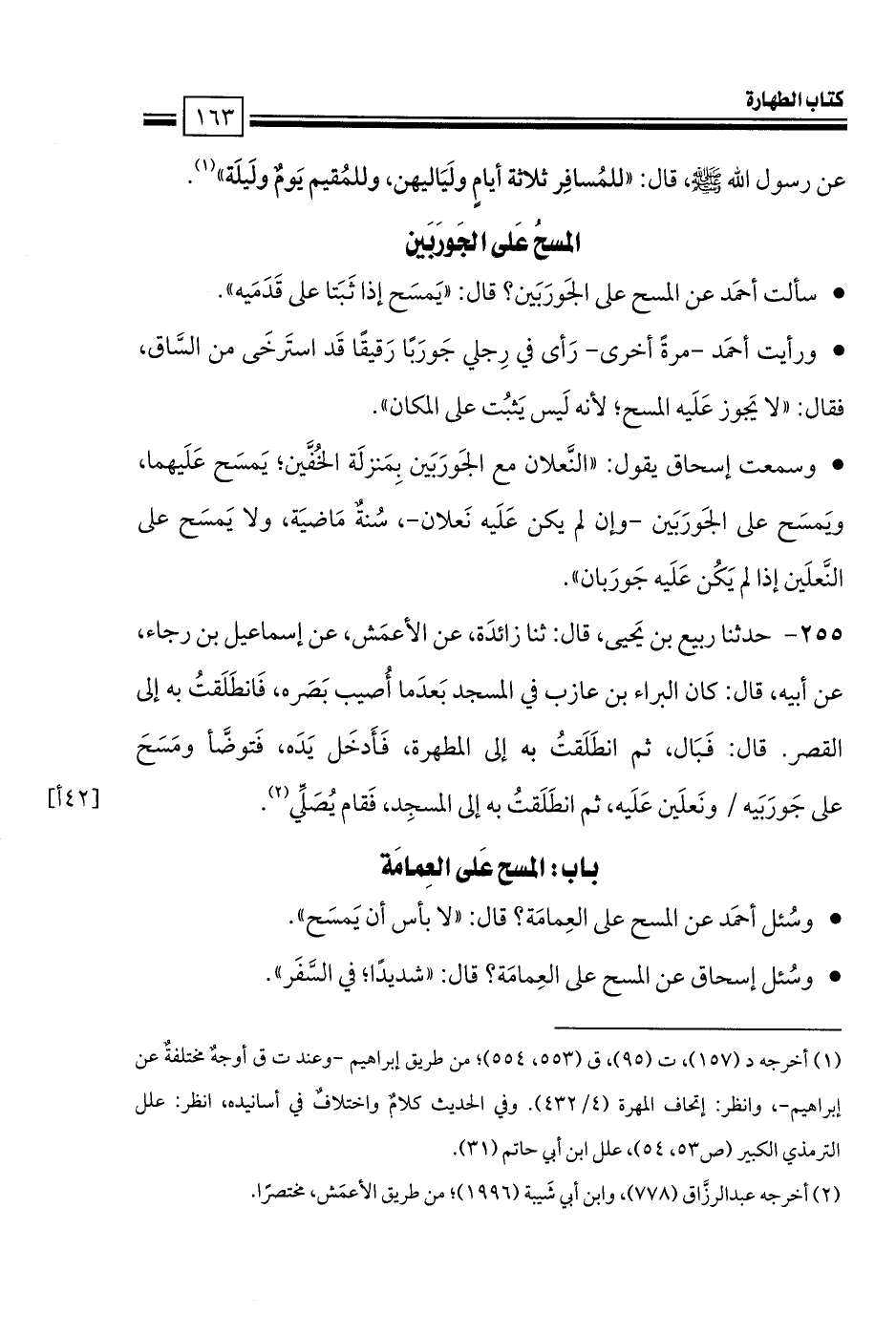 • وسُئل أحمَد عن المسح على العِمامَة؟ قال: «لا بأس أن يَمسَح».