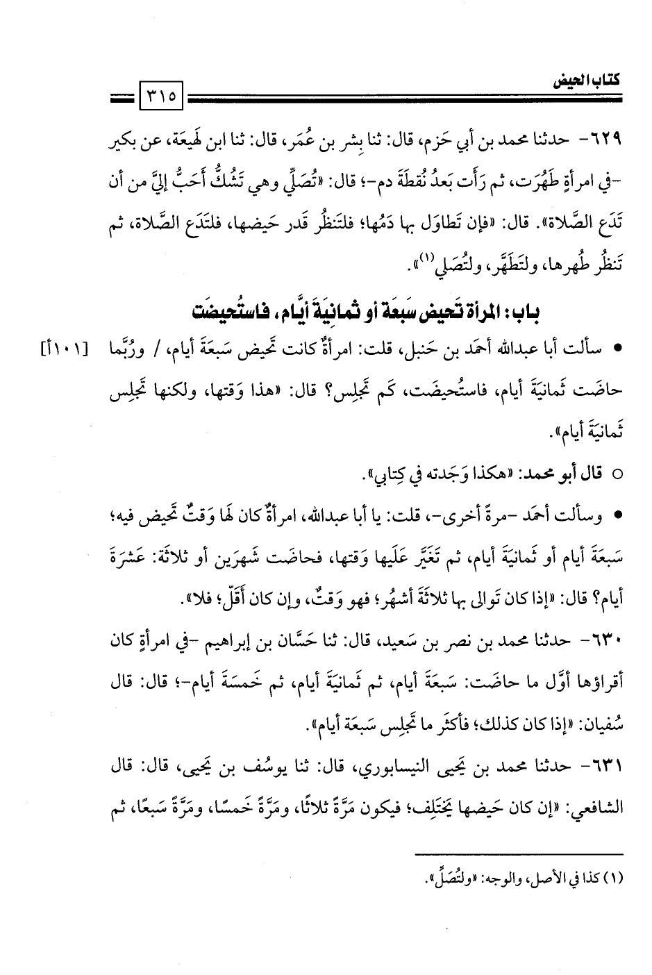 • سألت أبا عبد الله أحمَد بن حَنبل، قلت: امرأةٌ كانت تَحيض سَبعَةَ أيام، ورُبَّما حاضَت ثَمانيَةَ أيام، فاستُحيضَت، كَم تَجلِس؟ قال: «هذا وَقتها، ولكنها تَجلِس ثَمانيَةَ أيام».